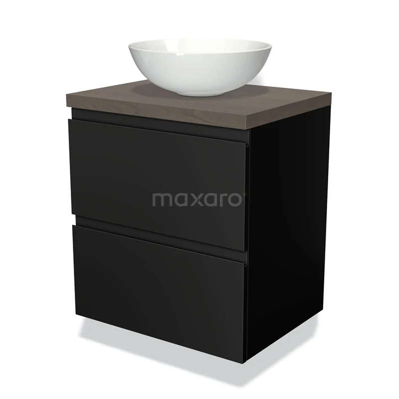 Modulo Plato Badmöbel mit Aufsatzwaschbecken | 60 cm Matt Schwarz Grifflos front Dunkelbraune Eiche blatt 2 übereinanderliegende Schubladen