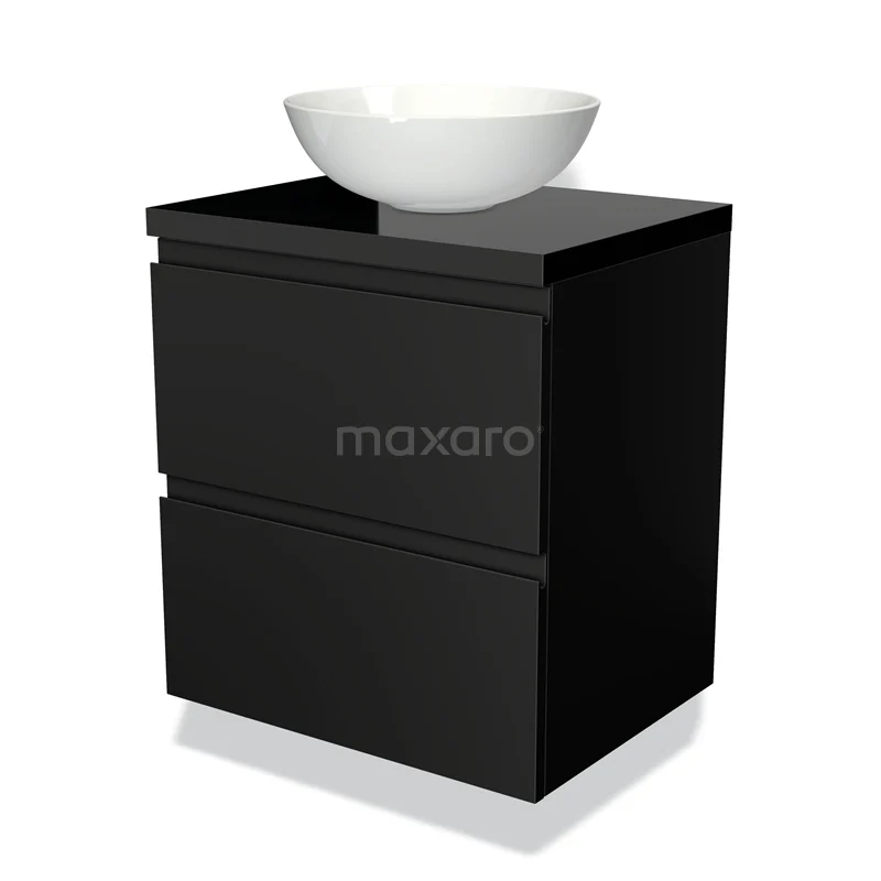 Modulo Plato Badmöbel mit Aufsatzwaschbecken | 60 cm Matt Schwarz Grifflos front Hochglanz Schwarz blatt 2 übereinanderliegende Schubladen