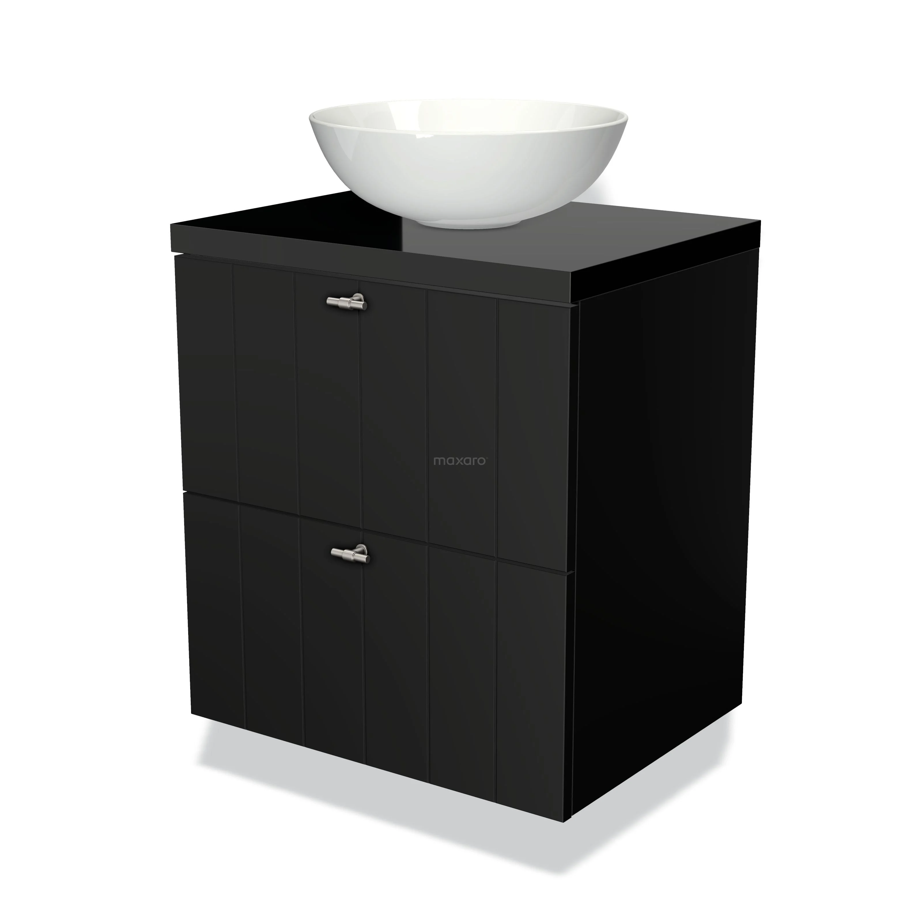 Modulo Plato Badmöbel mit Aufsatzwaschbecken | 60 cm Matt Schwarz Lamelle front Hochglanz Schwarz blatt 2 übereinanderliegende Schubladen