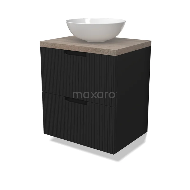 Modulo Plato Badmöbel mit Aufsatzwaschbecken | 60 cm Matt Schwarz Linie front Eiche blatt 2 übereinanderliegende Schubladen
