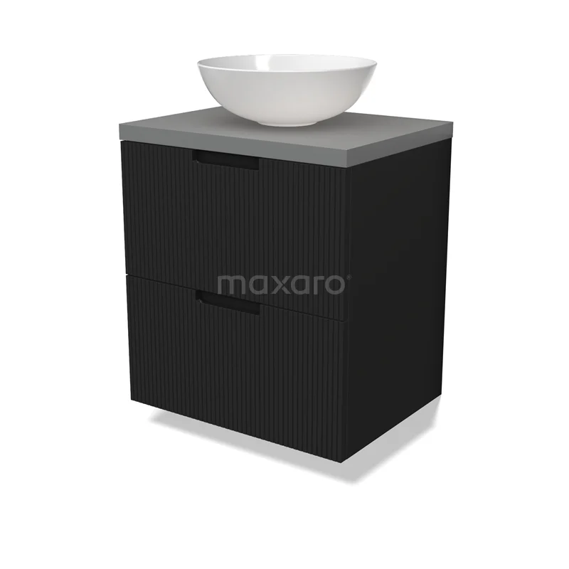 Modulo Plato Badmöbel mit Aufsatzwaschbecken | 60 cm Matt Schwarz Linie front Mittelgrau blatt 2 übereinanderliegende Schubladen