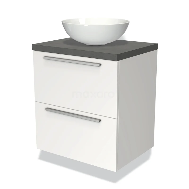 Modulo Plato Badmöbel mit Aufsatzwaschbecken | 60 cm Matt Weiß Flach front Dunkelgrauer Beton blatt 2 übereinanderliegende Schubladen