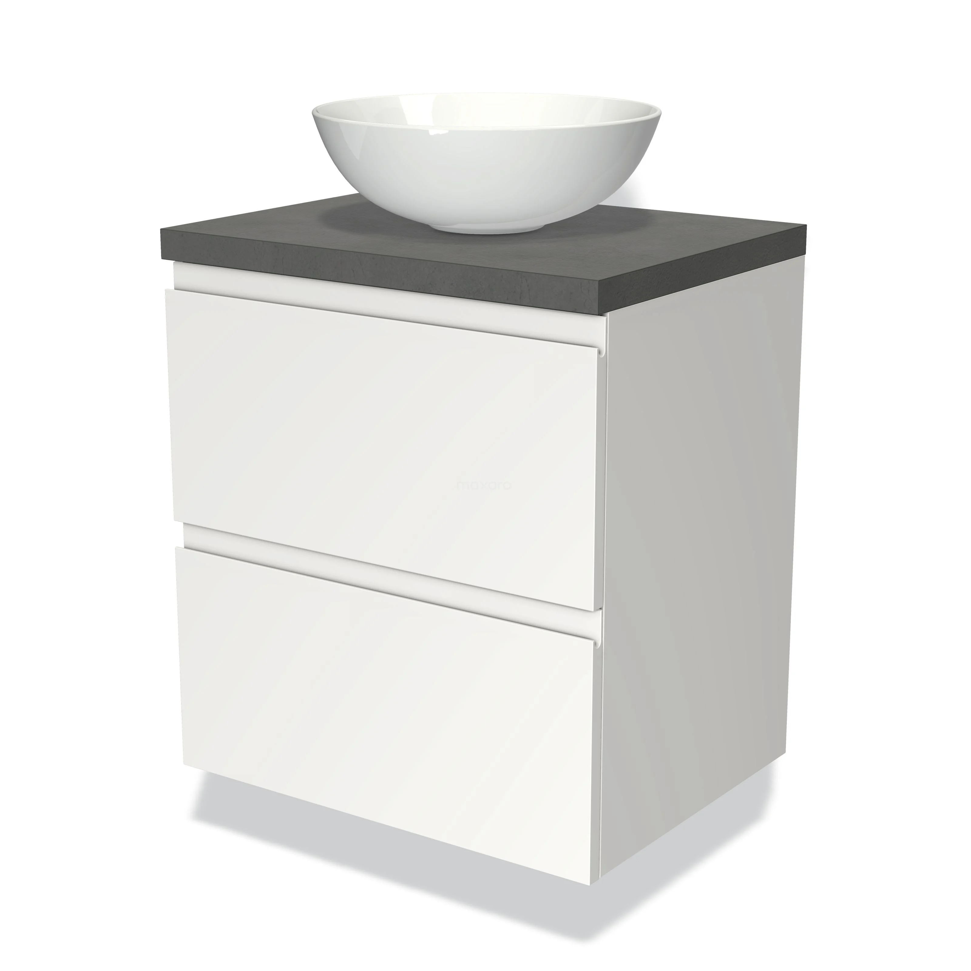 Modulo Plato Badmöbel mit Aufsatzwaschbecken | 60 cm Matt Weiß Grifflos front Dunkelgrauer Beton blatt 2 übereinanderliegende Schubladen