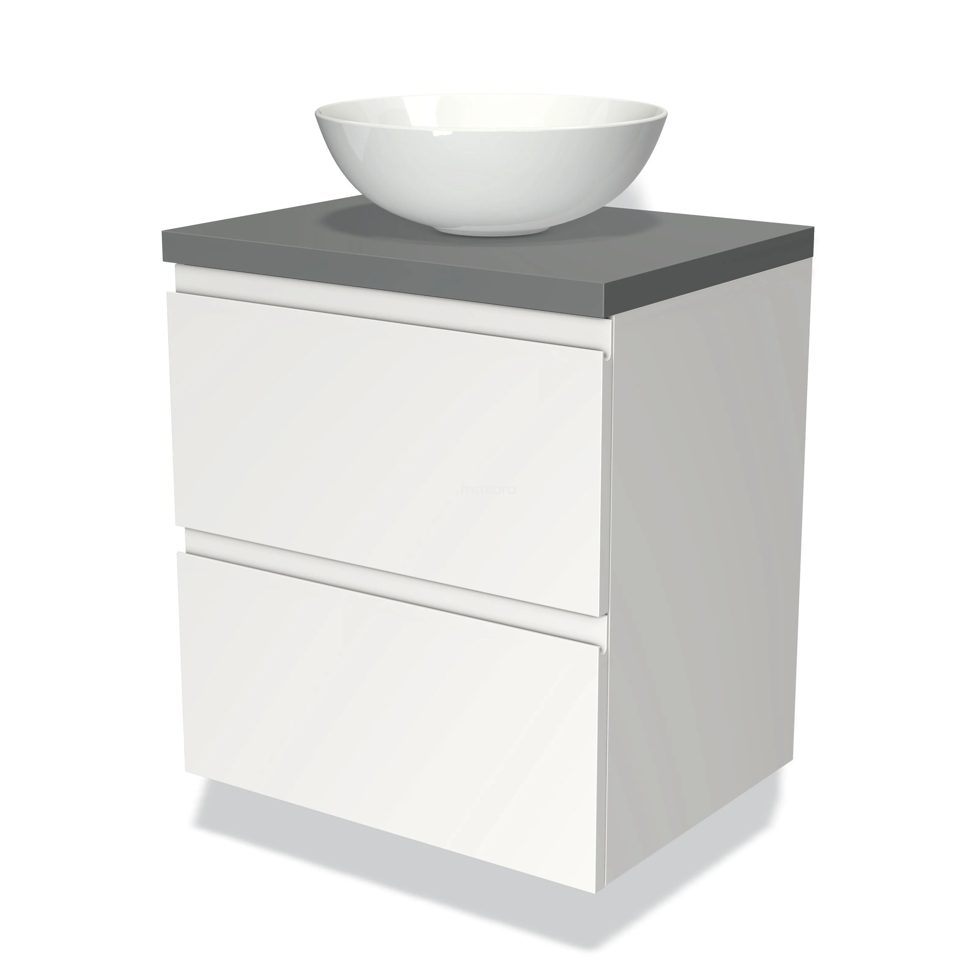 Modulo Plato Badmöbel mit Aufsatzwaschbecken | 60 cm Matt Weiß Grifflos front Mittelgrau blatt 2 übereinanderliegende Schubladen
