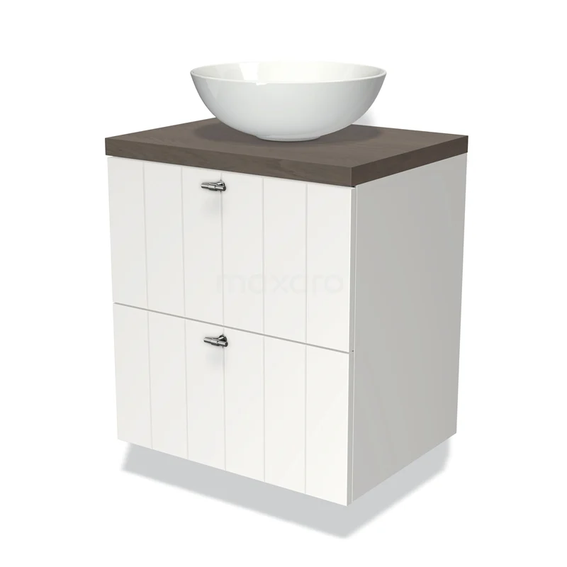 Modulo Plato Badmöbel mit Aufsatzwaschbecken | 60 cm Matt Weiß Lamelle front Dunkelbraune Eiche blatt 2 übereinanderliegende Schubladen