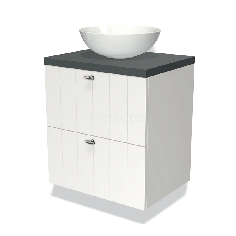 Modulo Plato Badmöbel mit Aufsatzwaschbecken | 60 cm Matt Weiß Lamelle front Dunkelgrau blatt 2 übereinanderliegende Schubladen