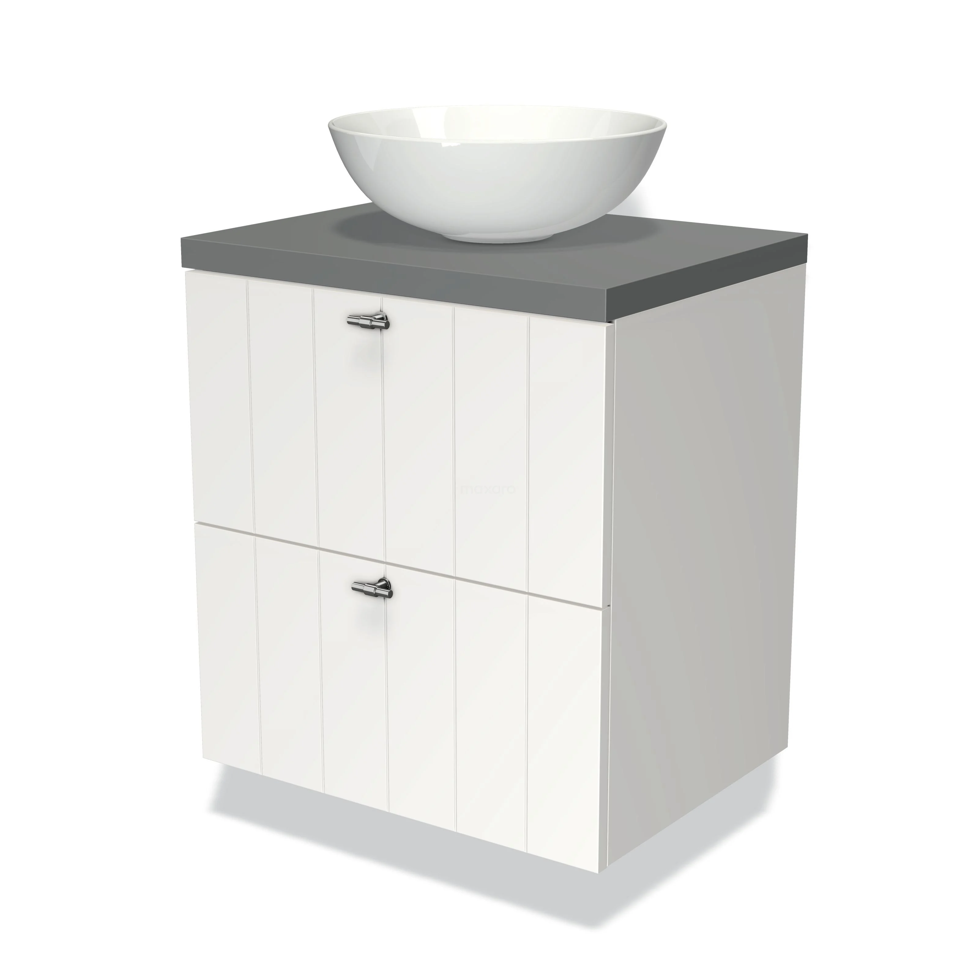 Modulo Plato Badmöbel mit Aufsatzwaschbecken | 60 cm Matt Weiß Lamelle front Mittelgrau blatt 2 übereinanderliegende Schubladen