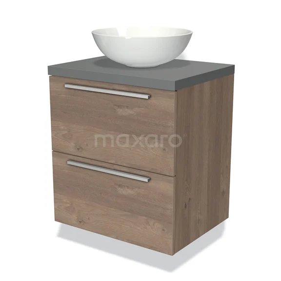 Modulo Plato Badmöbel mit Aufsatzwaschbecken | 60 cm Mittelbraune Eiche Flach front Mittelgrau blatt 2 übereinanderliegende Schubladen