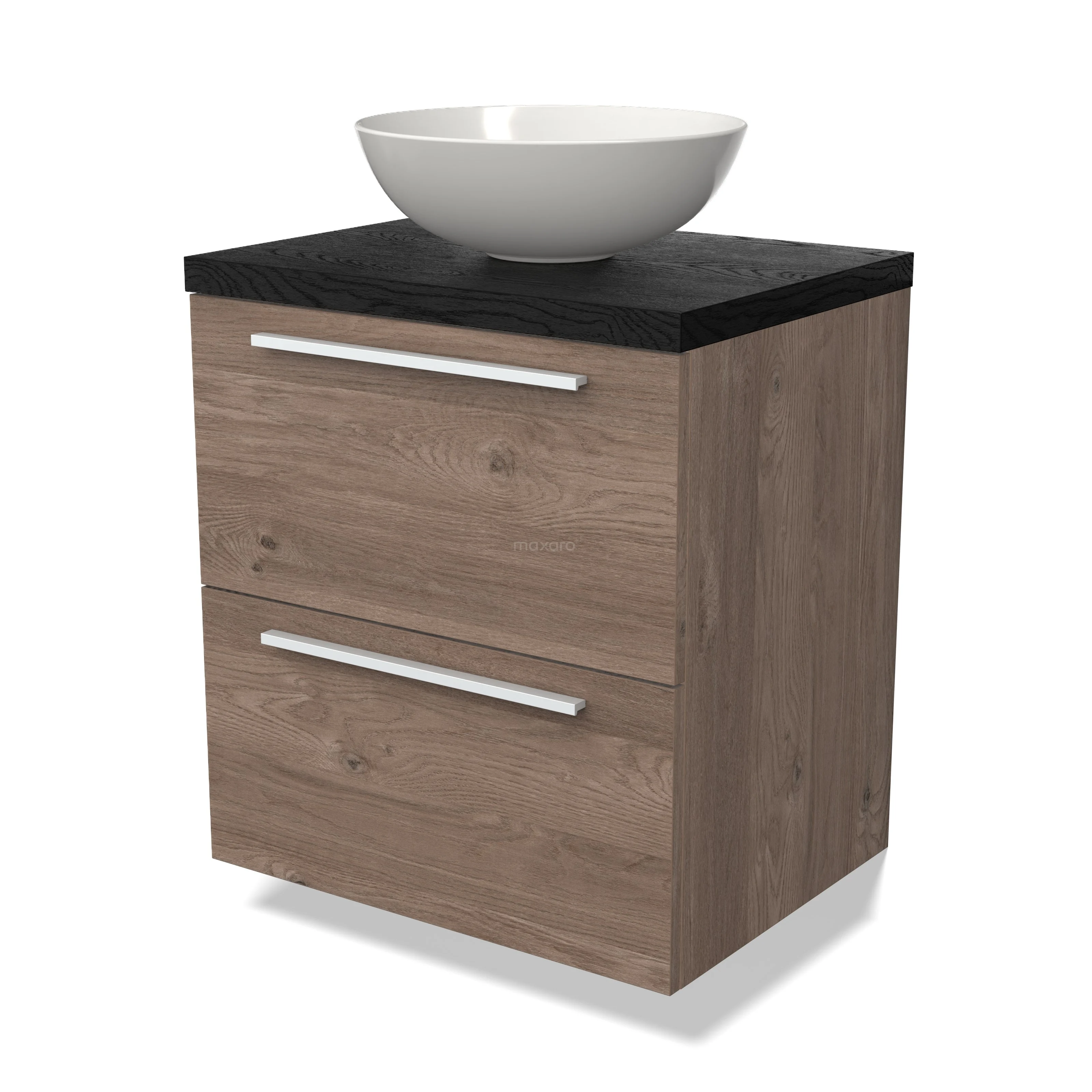Modulo Plato Badmöbel mit Aufsatzwaschbecken | 60 cm Mittelbraune Eiche Flach front Schwarze Eiche blatt 2 übereinanderliegende Schubladen