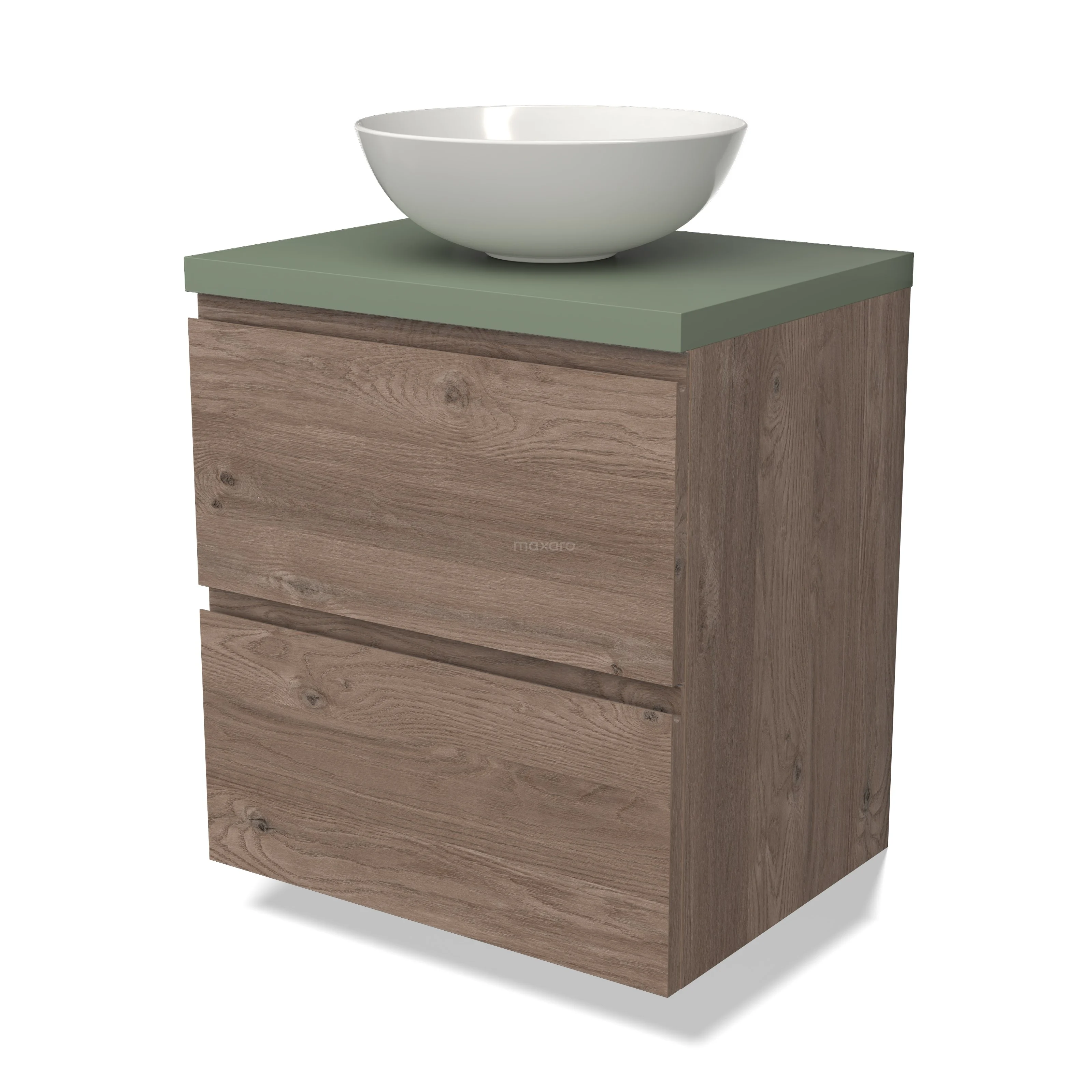 Modulo Plato Badmöbel mit Aufsatzwaschbecken | 60 cm Mittelbraune Eiche Grifflos front Salbeigrün blatt 2 übereinanderliegende Schubladen