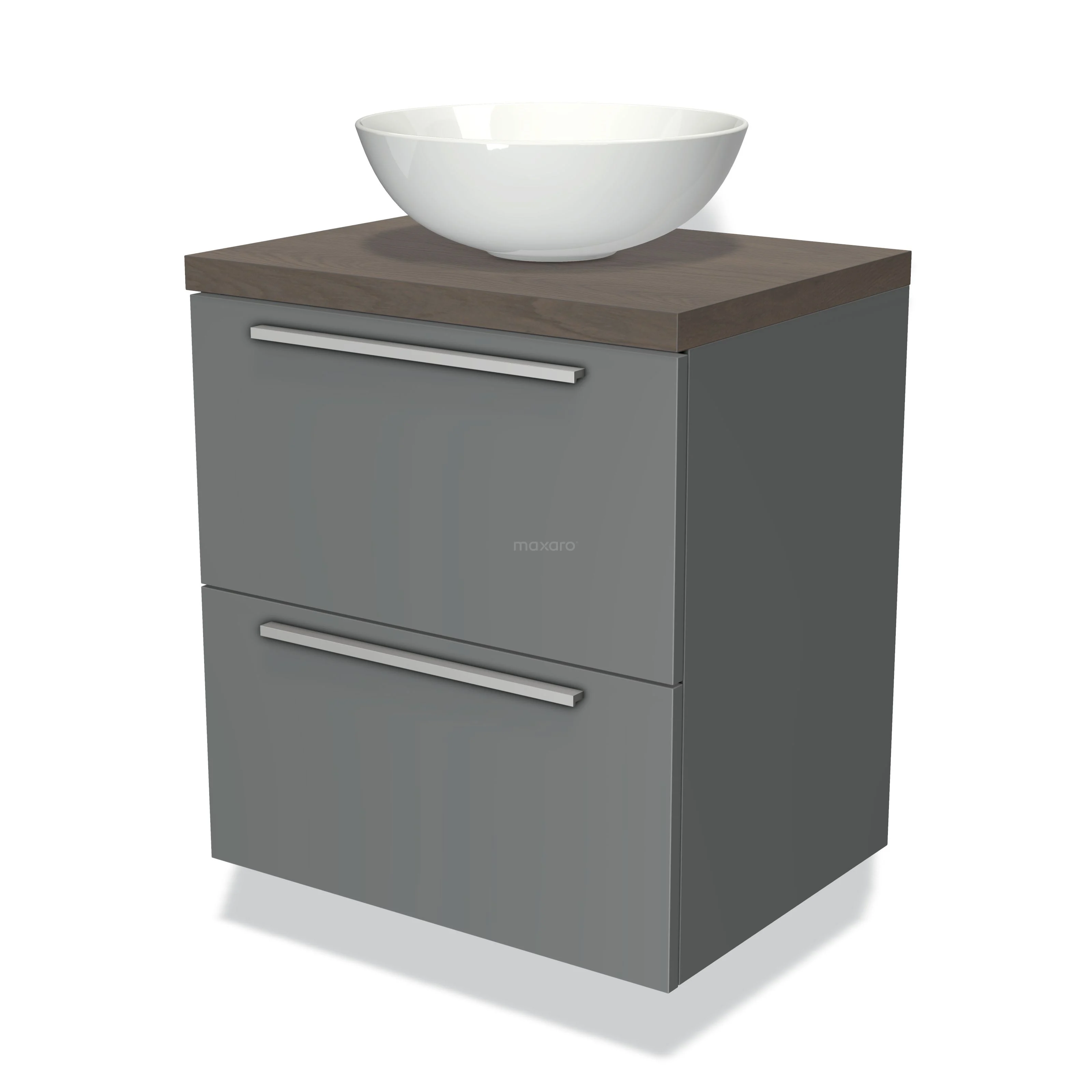 Modulo Plato Badmöbel mit Aufsatzwaschbecken | 60 cm Mittelgrau Flach front Dunkelbraune Eiche blatt 2 übereinanderliegende Schubladen