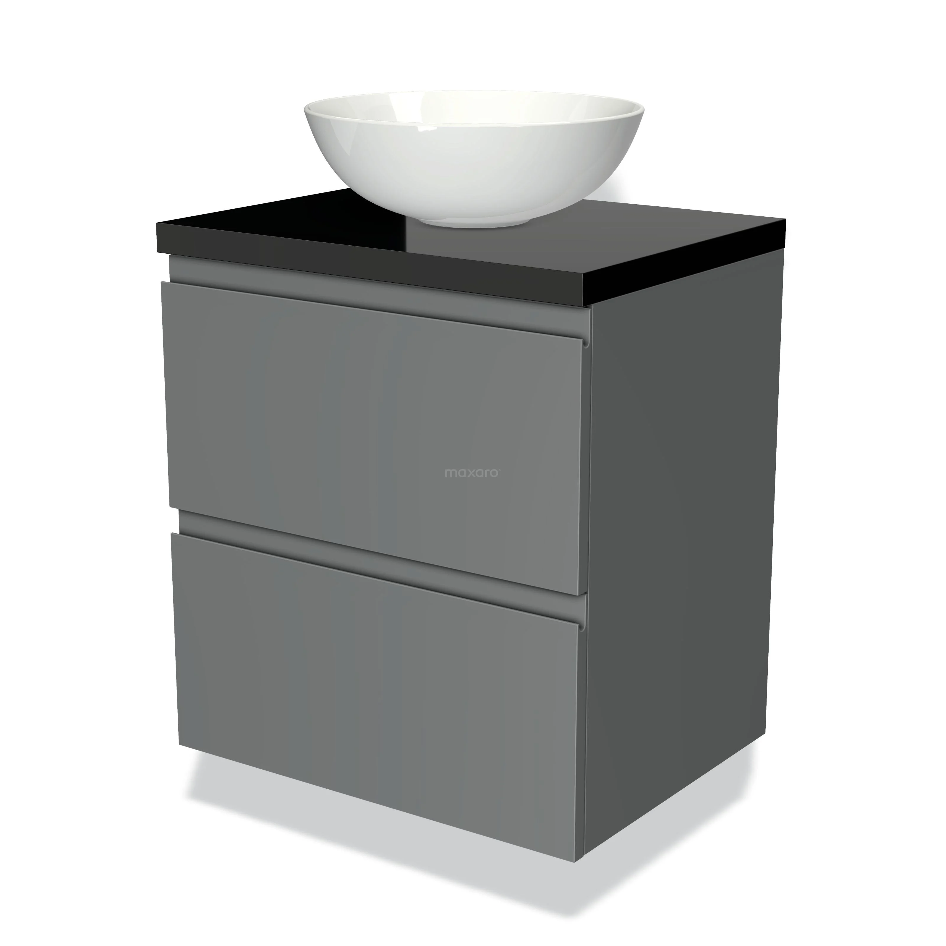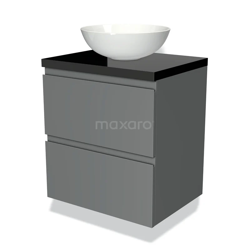 Modulo Plato Badmöbel mit Aufsatzwaschbecken | 60 cm Mittelgrau Grifflos front Hochglanz Schwarz blatt 2 übereinanderliegende Schubladen