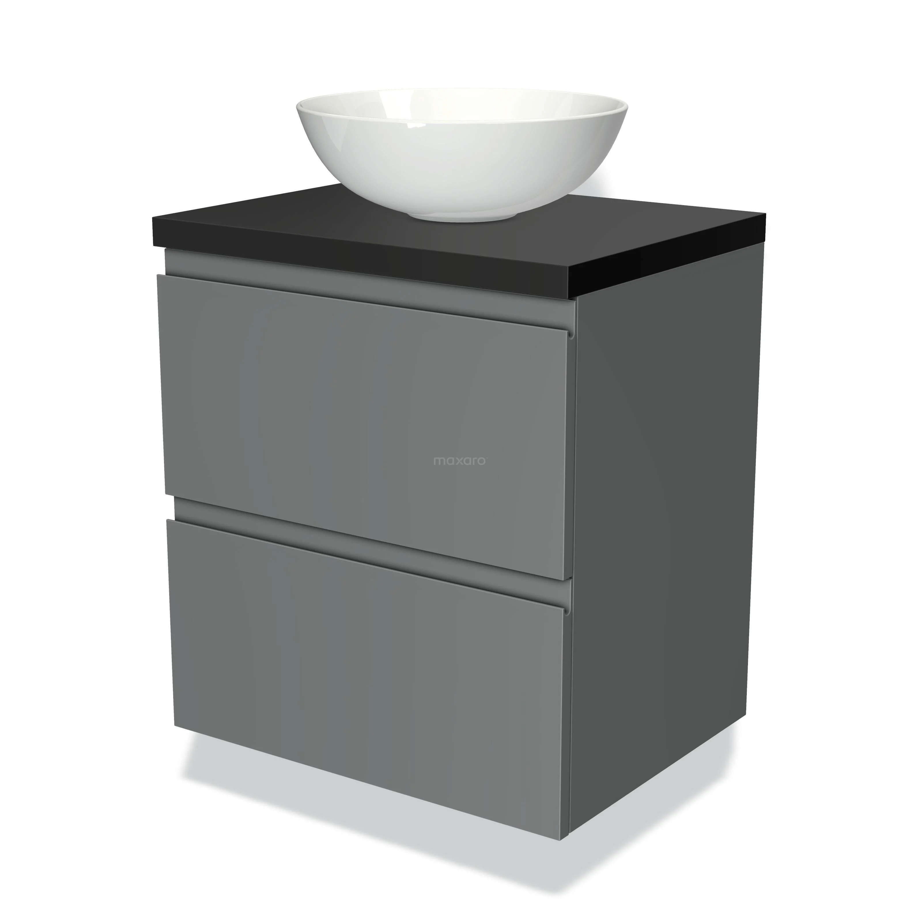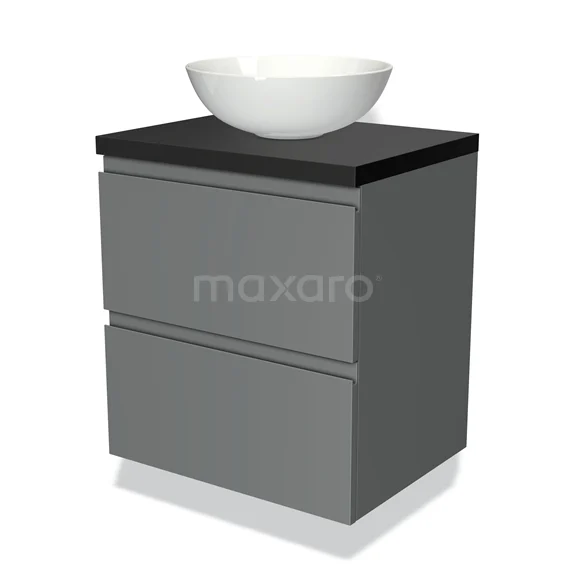 Modulo Plato Badmöbel mit Aufsatzwaschbecken | 60 cm Mittelgrau Grifflos front Matt Schwarz blatt 2 übereinanderliegende Schubladen