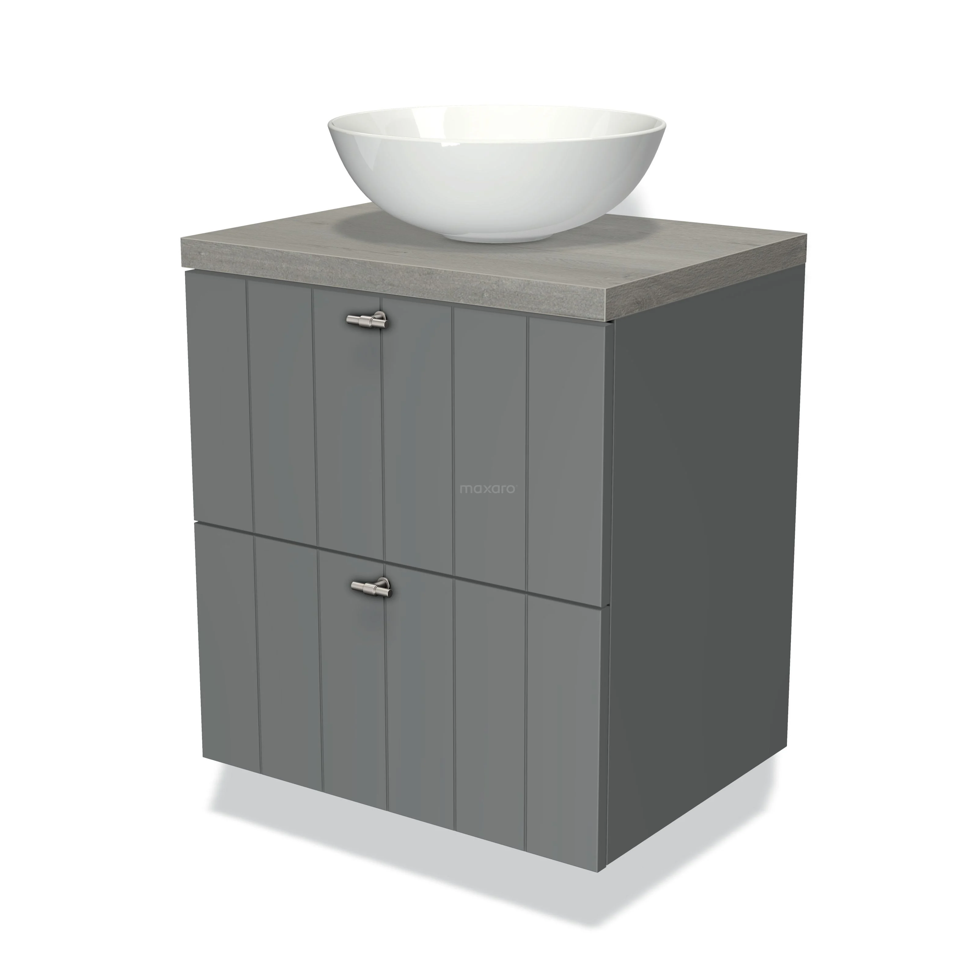 Modulo Plato Badmöbel mit Aufsatzwaschbecken | 60 cm Mittelgrau Lamelle front Graue Eiche blatt 2 übereinanderliegende Schubladen