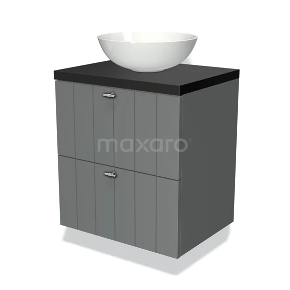 Modulo Plato Badmöbel mit Aufsatzwaschbecken | 60 cm Mittelgrau Lamelle front Matt Schwarz blatt 2 übereinanderliegende Schubladen