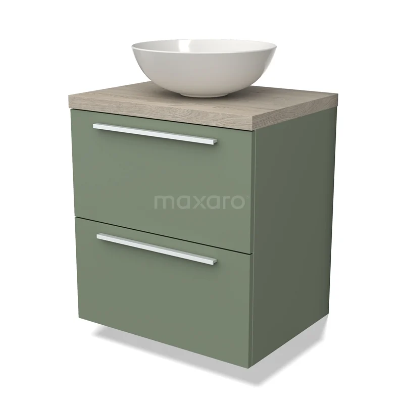 Modulo Plato Badmöbel mit Aufsatzwaschbecken | 60 cm Salbeigrün Flach front Hellgraue Eiche blatt 2 übereinanderliegende Schubladen