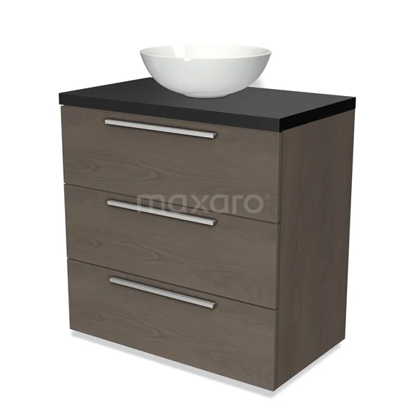 Modulo Plato Badmöbel mit Aufsatzwaschbecken | 80 cm Dunkelbraune Eiche Flach front Matt Schwarz blatt 3 Schubladen