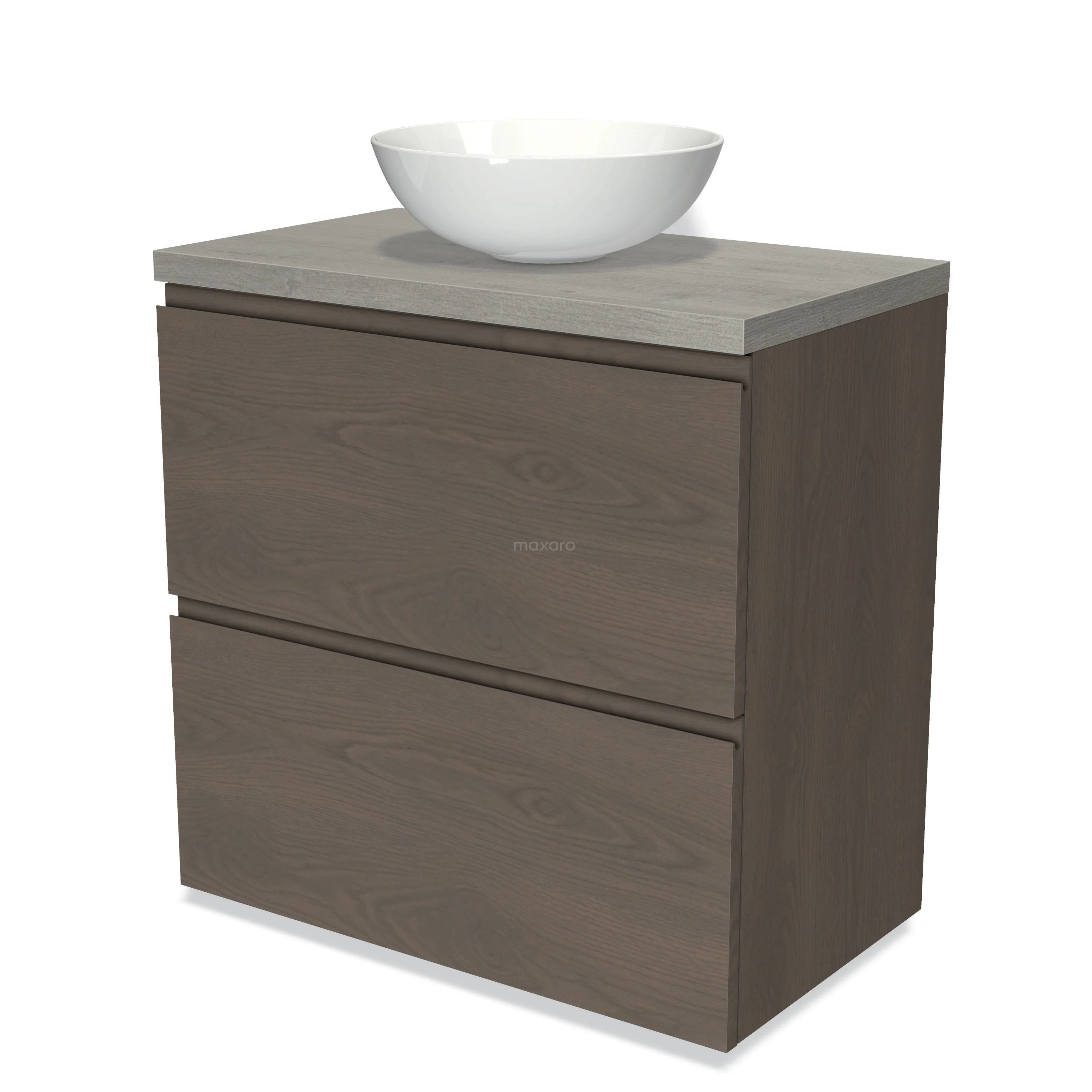 Modulo Plato Badmöbel mit Aufsatzwaschbecken | 80 cm Dunkelbraune Eiche Grifflos front Graue Eiche blatt 2 hohe Schubladen übereinanderliegend
