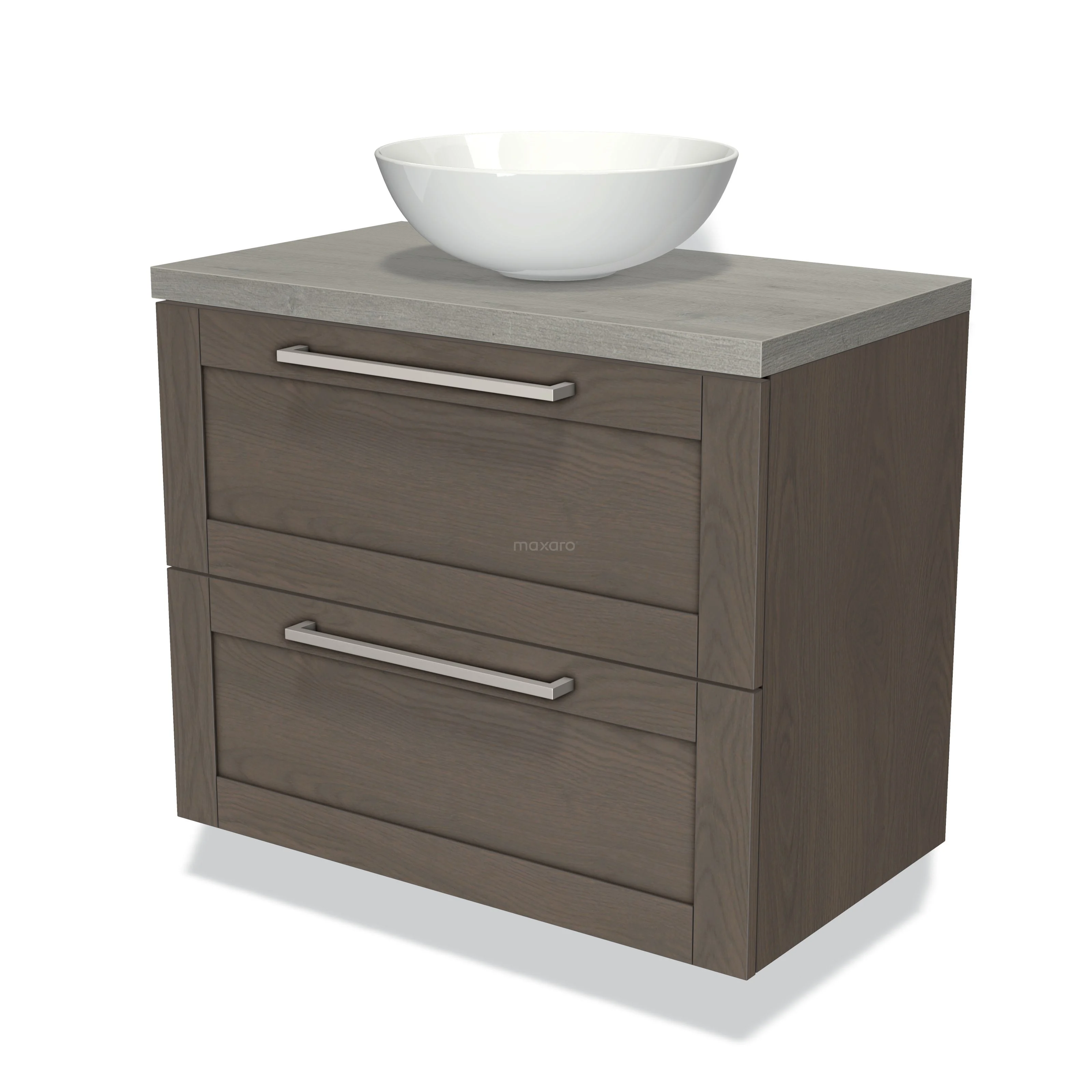 Modulo Plato Badmöbel mit Aufsatzwaschbecken | 80 cm Dunkelbraune Eiche Rahmen front Graue Eiche blatt 2 übereinanderliegende Schubladen
