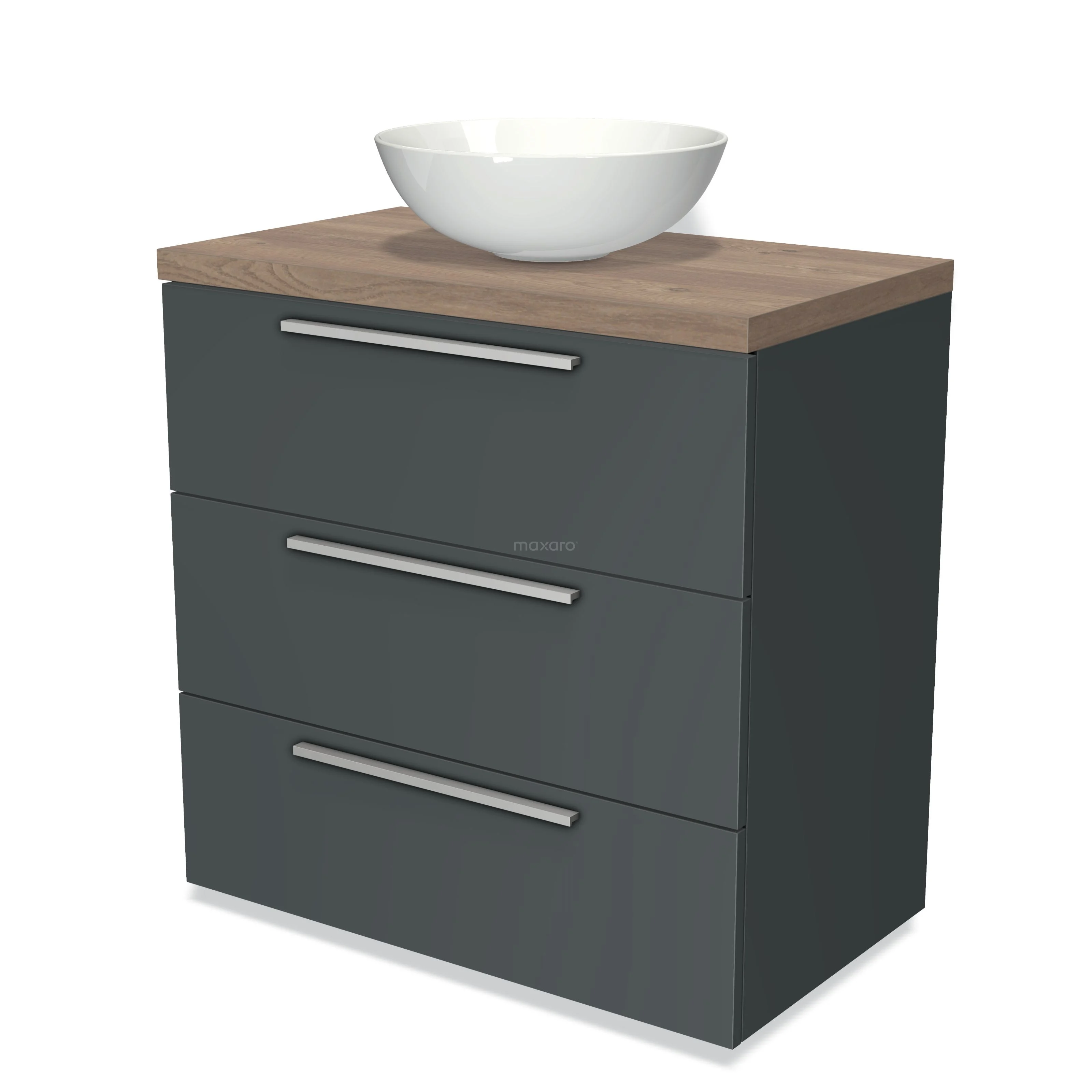 Modulo Plato Badmöbel mit Aufsatzwaschbecken | 80 cm Dunkelgrau Flach front Mittelbraune Eiche blatt 3 Schubladen