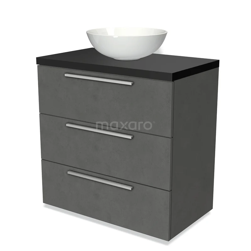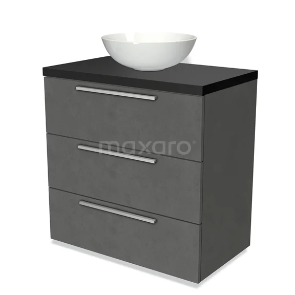 Modulo Plato Badmöbel mit Aufsatzwaschbecken | 80 cm Dunkelgrauer Beton Flach front Matt Schwarz blatt 3 Schubladen