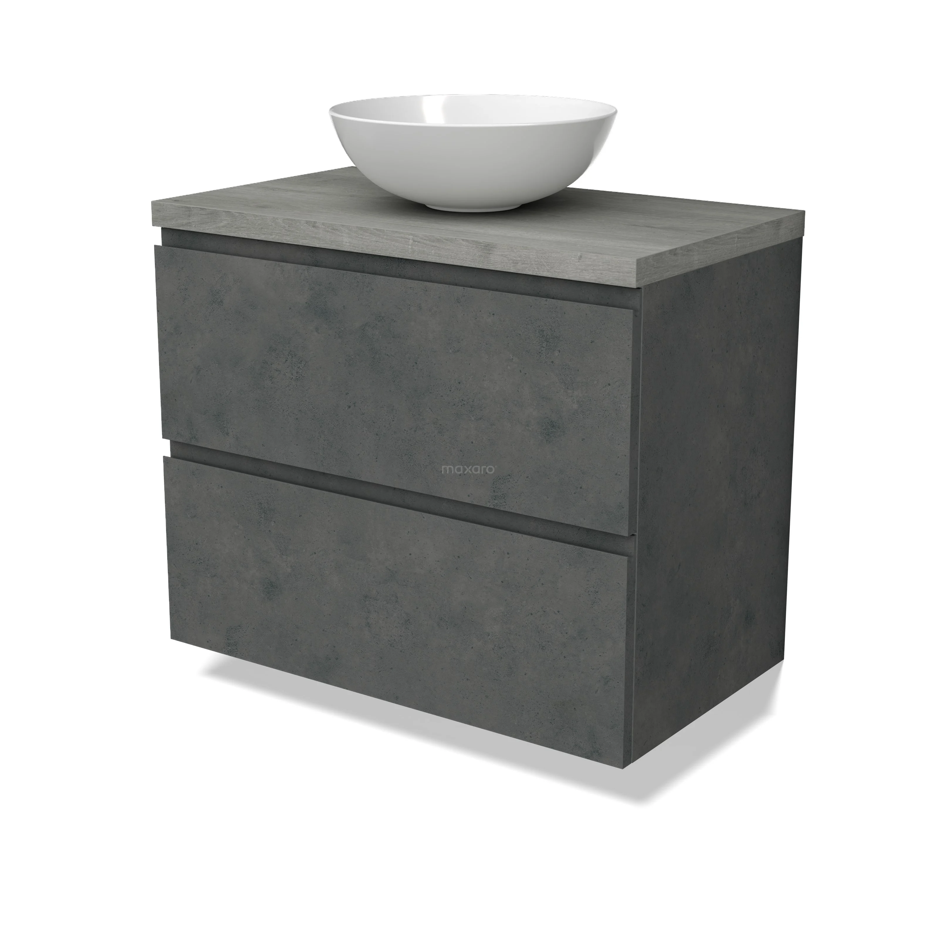 Modulo Plato Badmöbel mit Aufsatzwaschbecken | 80 cm Dunkelgrauer Beton Grifflos front Graue Eiche blatt 2 übereinanderliegende Schubladen