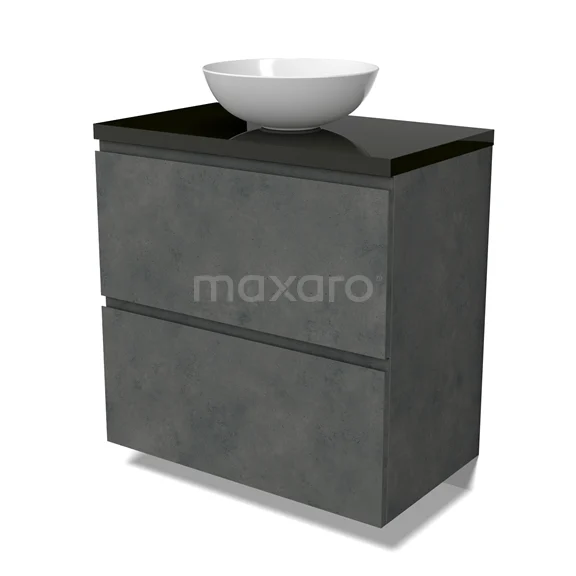 Modulo Plato Badmöbel mit Aufsatzwaschbecken | 80 cm Dunkelgrauer Beton Grifflos front Hochglanz Schwarz blatt 2 hohe Schubladen übereinanderliegend