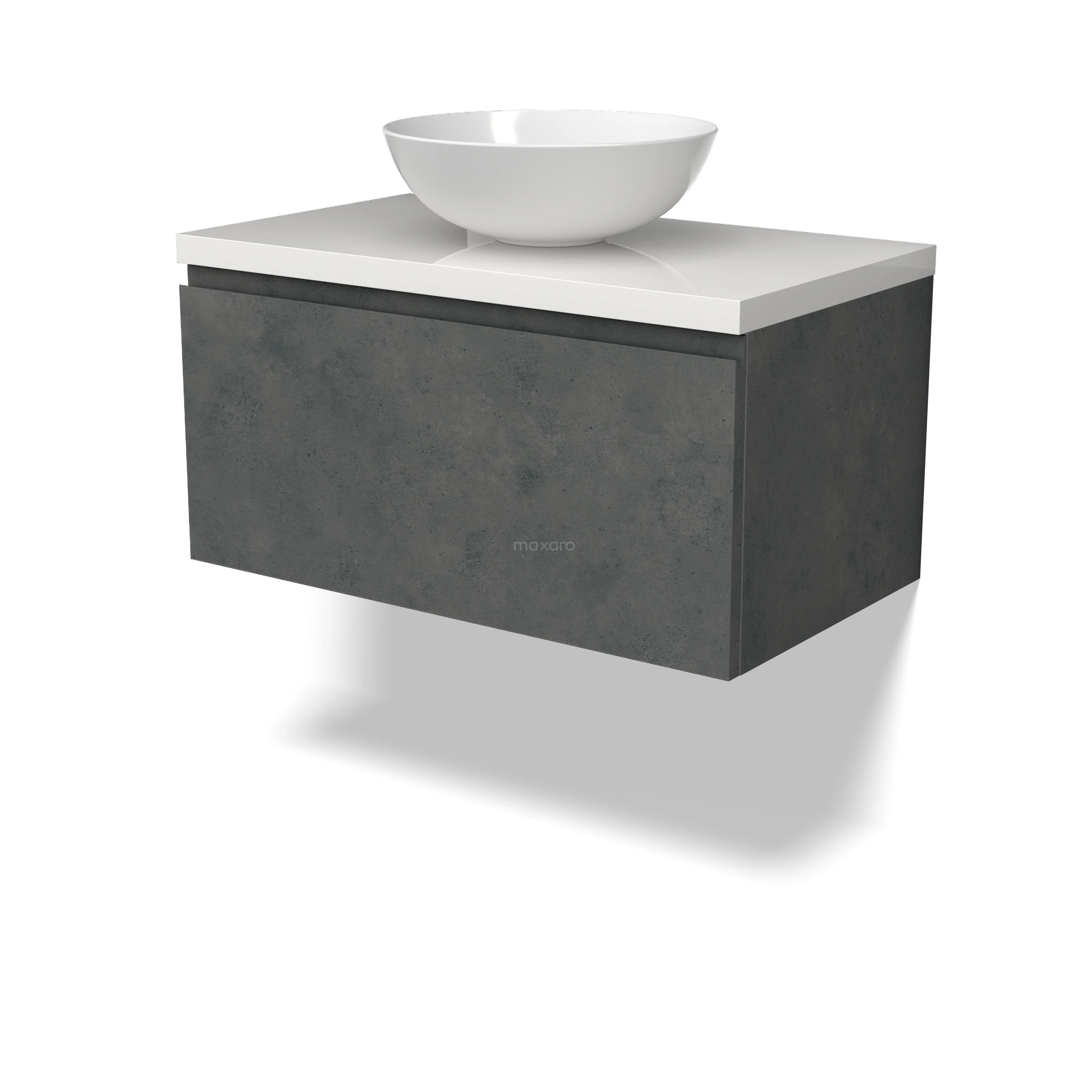 Modulo Plato Badmöbel mit Aufsatzwaschbecken | 80 cm Dunkelgrauer Beton Grifflos front Hochglanz Weiß blatt 1 Schublade