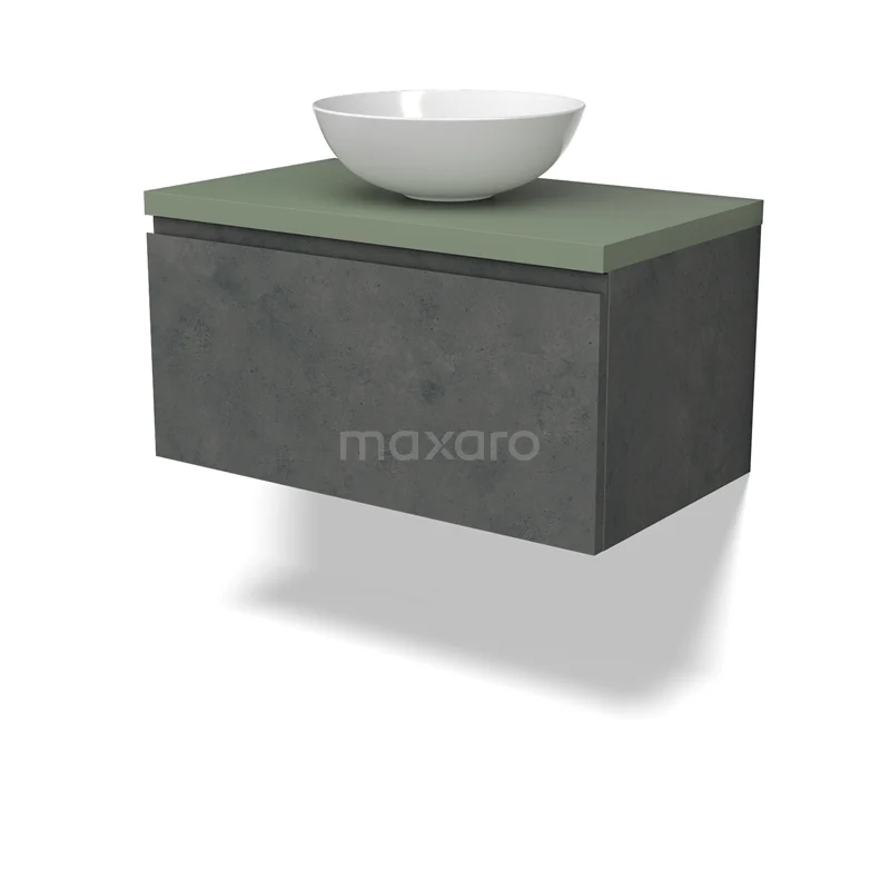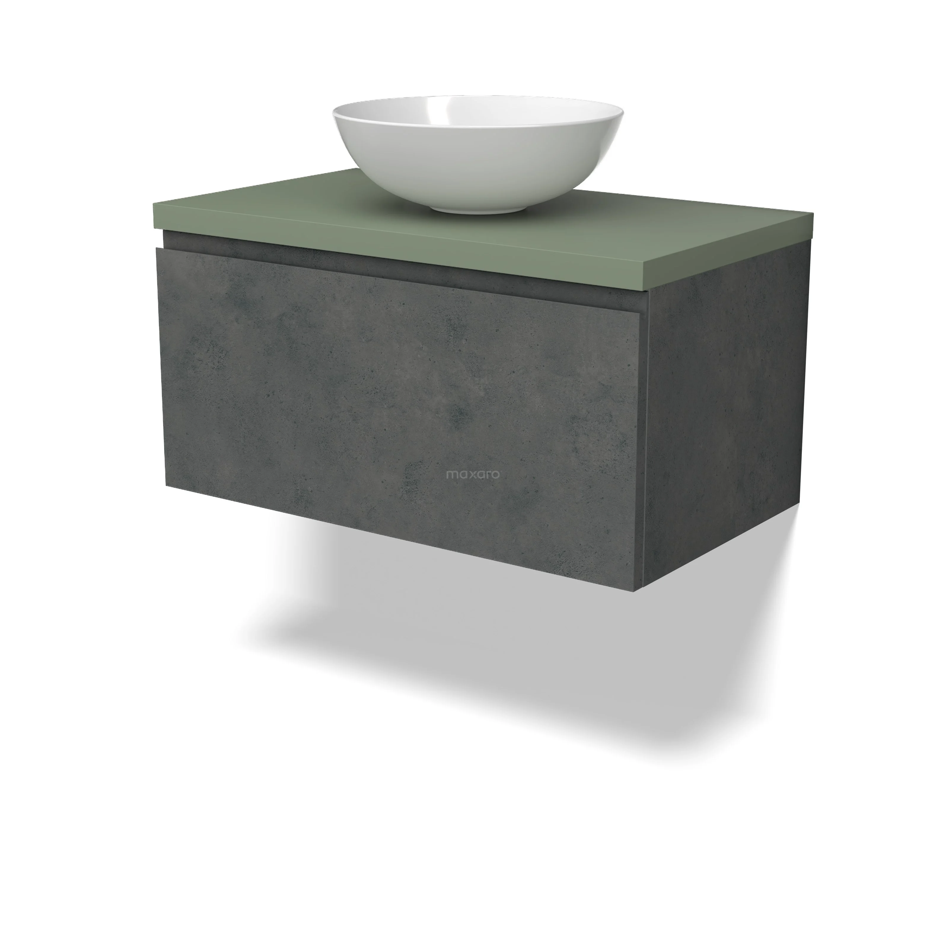 Modulo Plato Badmöbel mit Aufsatzwaschbecken | 80 cm Dunkelgrauer Beton Grifflos front Salbeigrün blatt 1 Schublade