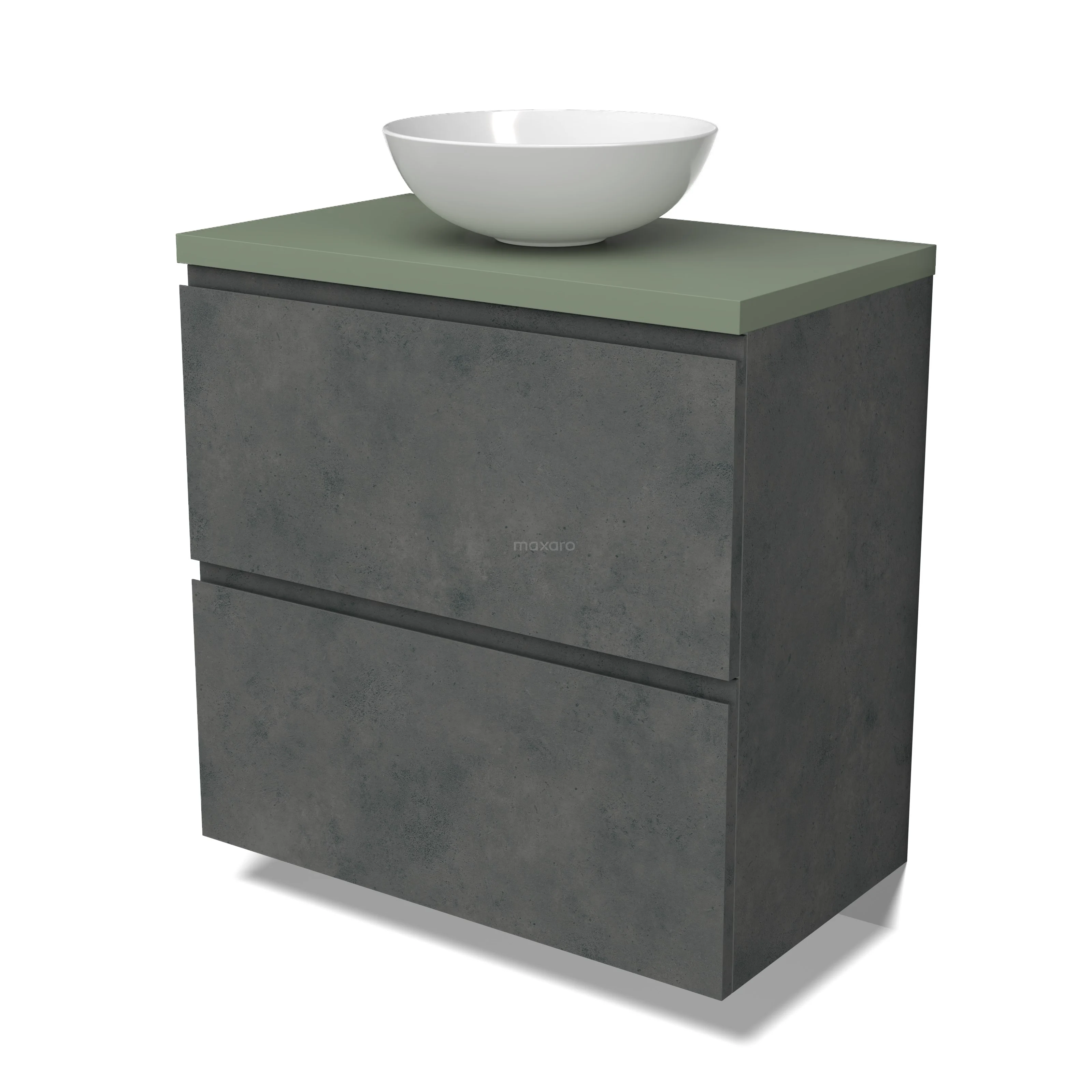 Modulo Plato Badmöbel mit Aufsatzwaschbecken | 80 cm Dunkelgrauer Beton Grifflos front Salbeigrün blatt 2 hohe Schubladen übereinanderliegend