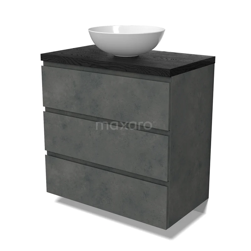 Modulo Plato Badmöbel mit Aufsatzwaschbecken | 80 cm Dunkelgrauer Beton Grifflos front Schwarze Eiche blatt 3 Schubladen
