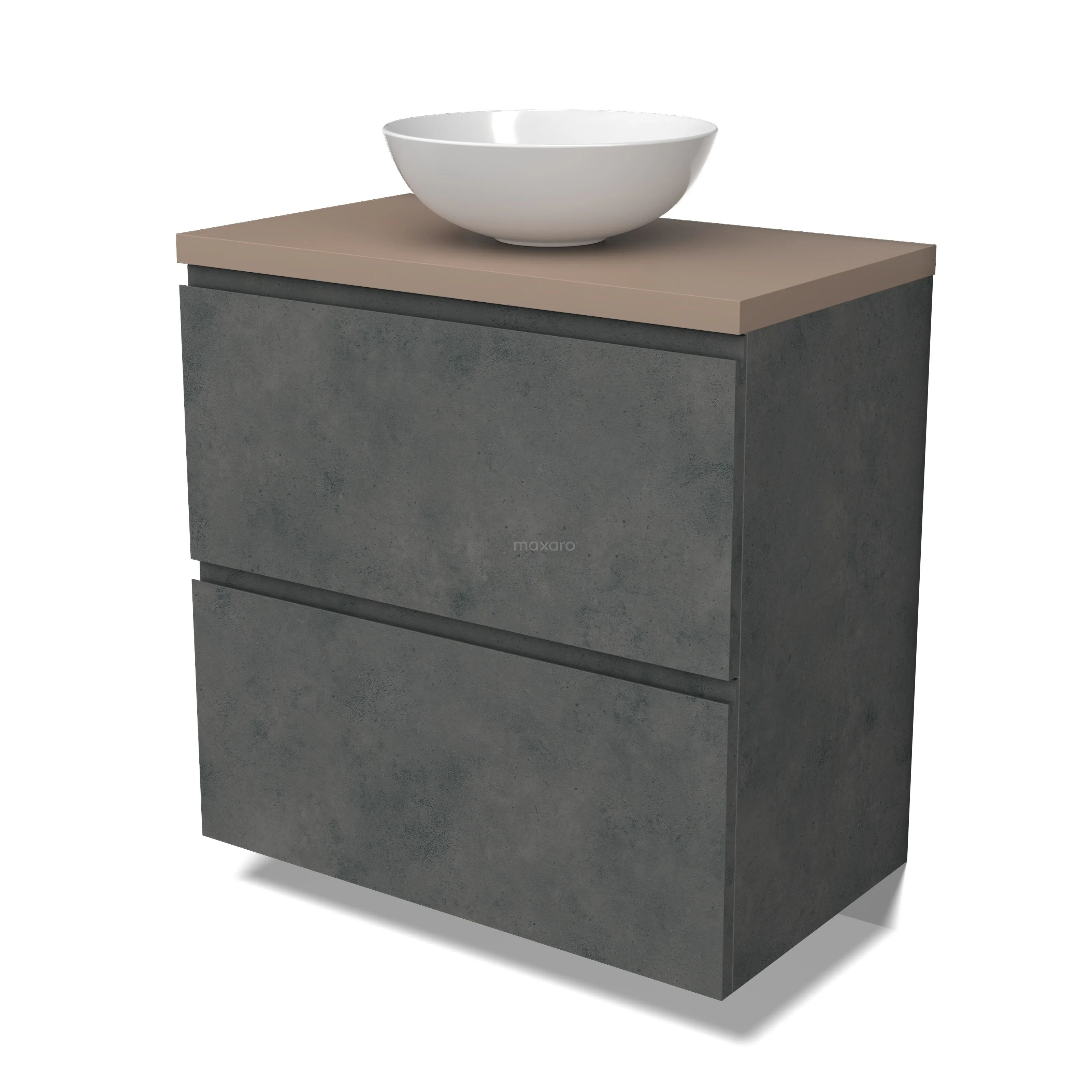 Modulo Plato Badmöbel mit Aufsatzwaschbecken | 80 cm Dunkelgrauer Beton Grifflos front Taupe blatt 2 hohe Schubladen übereinanderliegend BMK13-01050