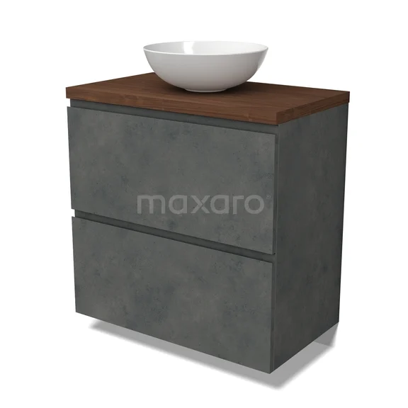 Modulo Plato Badmöbel mit Aufsatzwaschbecken | 80 cm Dunkelgrauer Beton Grifflos front Walnuss blatt 2 hohe Schubladen übereinanderliegend