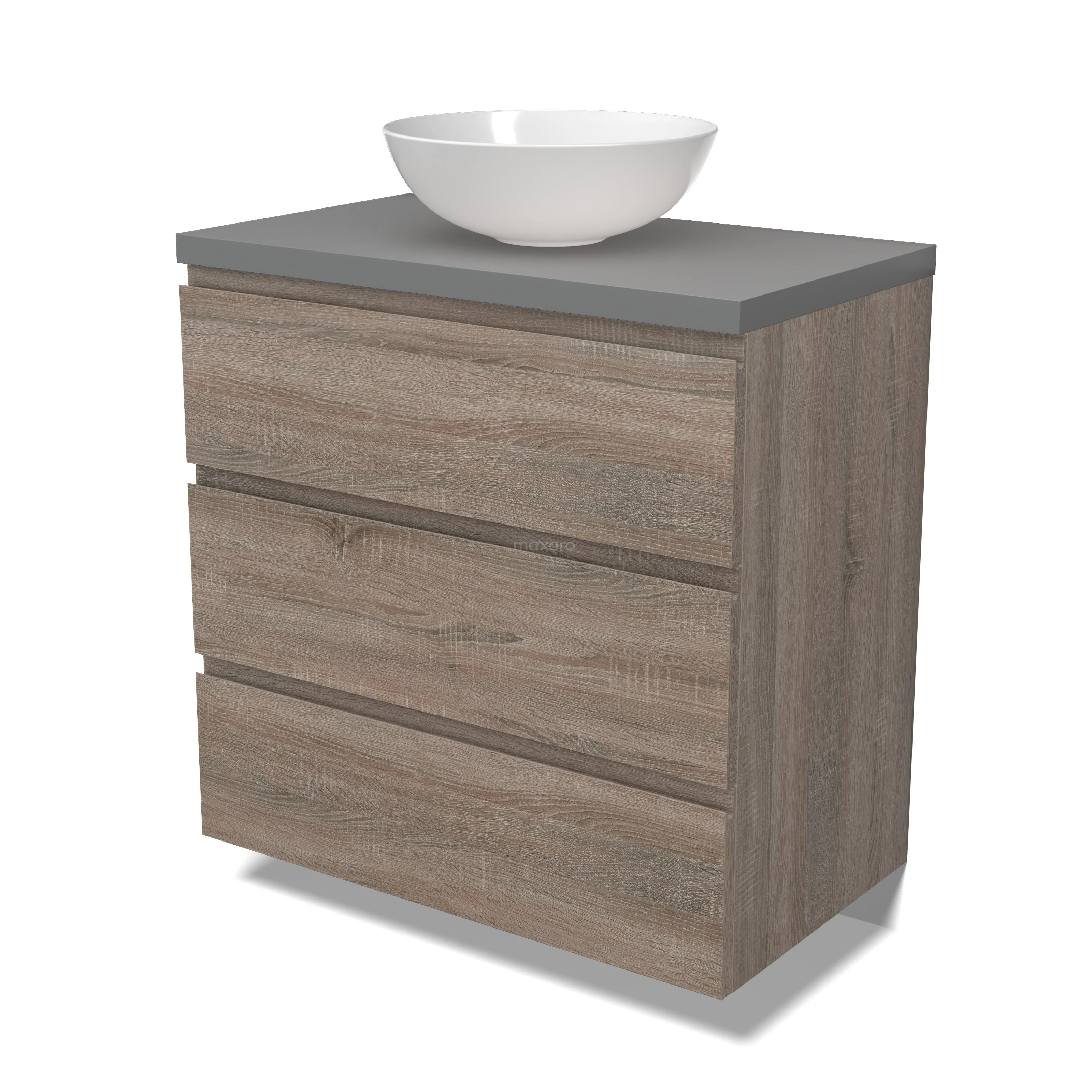 Modulo Plato Badmöbel mit Aufsatzwaschbecken | 80 cm Eiche Grifflos front Mittelgrau blatt 3 Schubladen