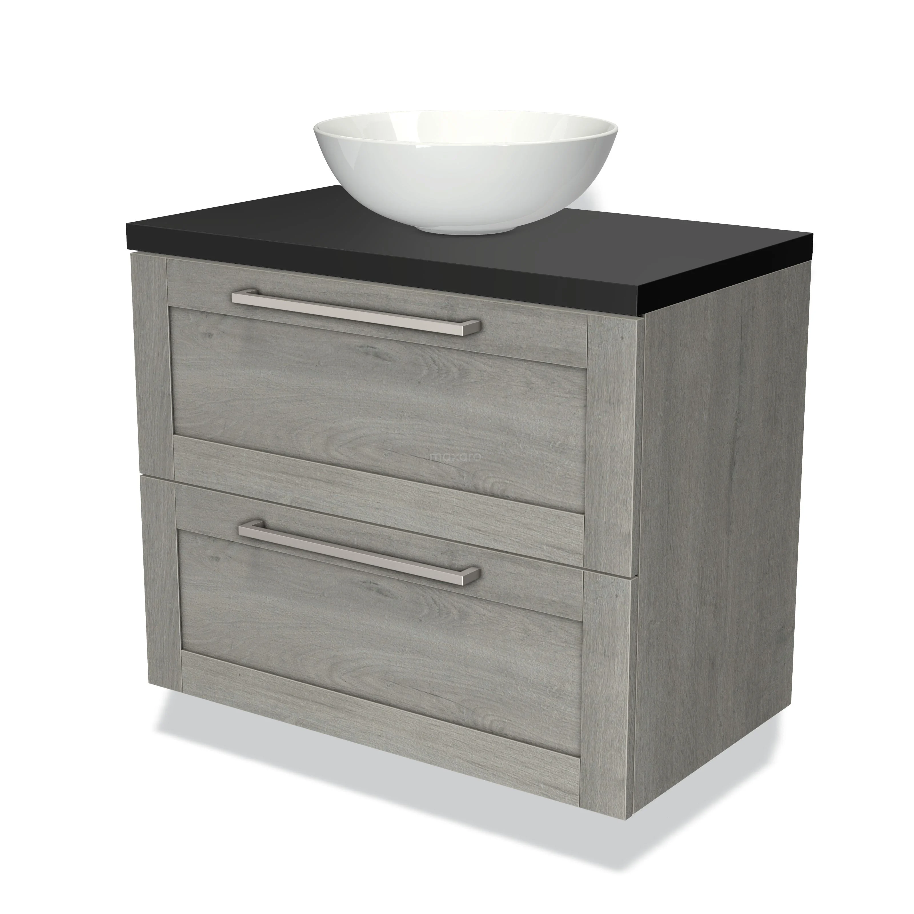 Modulo Plato Badmöbel mit Aufsatzwaschbecken | 80 cm Graue Eiche Rahmen front Matt Schwarz blatt 2 übereinanderliegende Schubladen