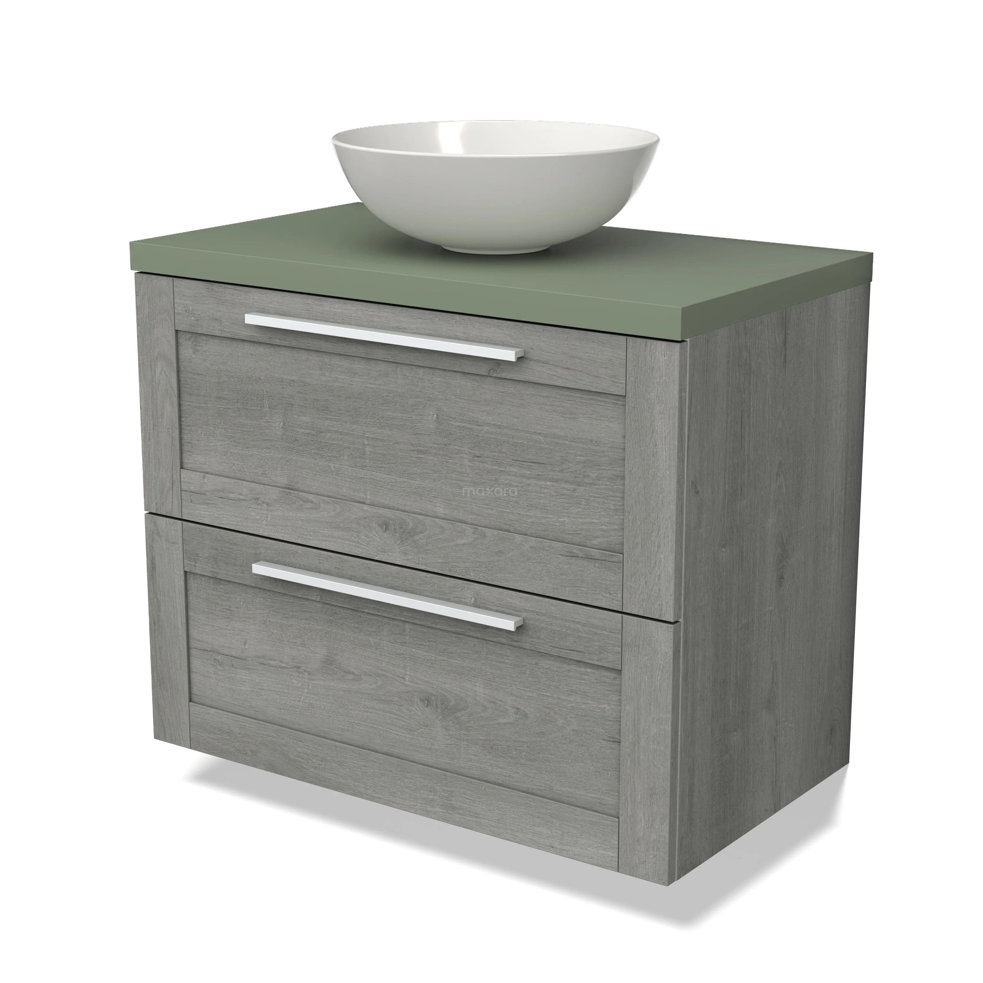 Modulo Plato Badmöbel mit Aufsatzwaschbecken | 80 cm Graue Eiche Rahmen front Salbeigrün blatt 2 übereinanderliegende Schubladen
