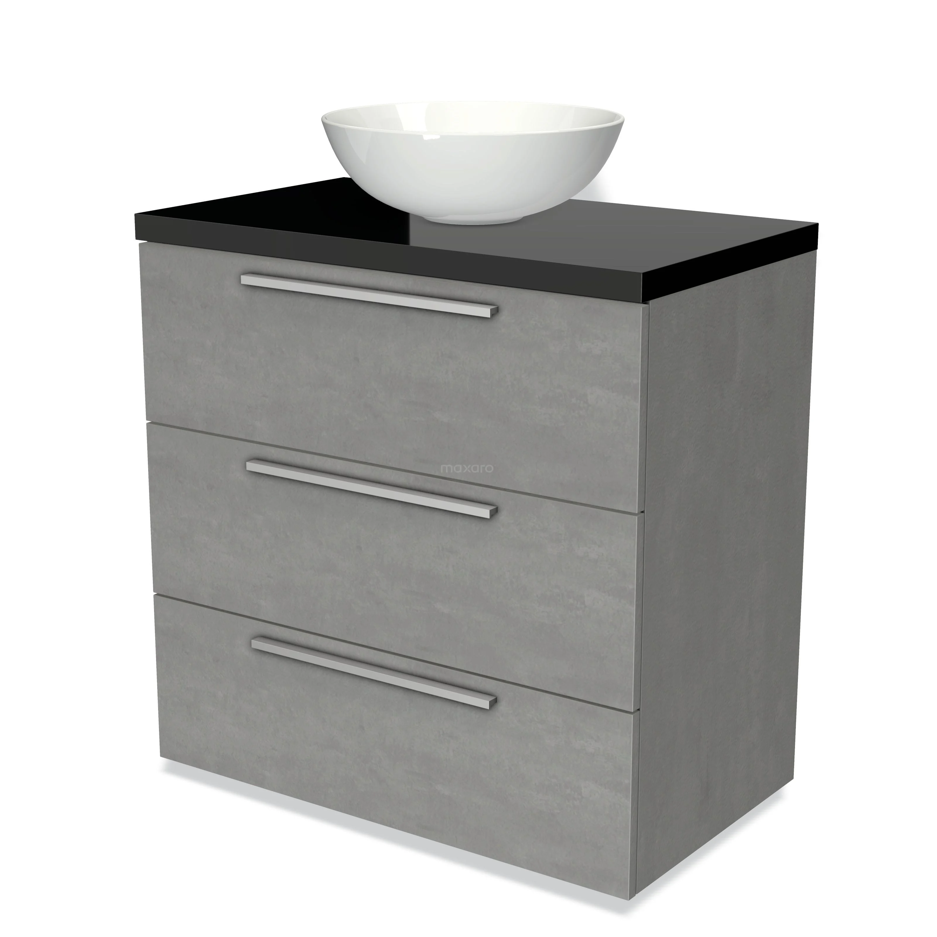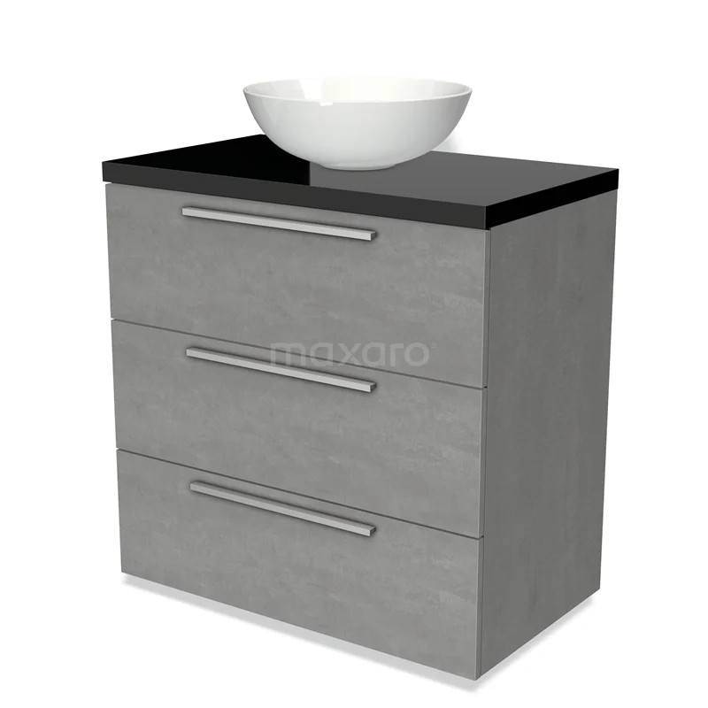 Modulo Plato Badmöbel mit Aufsatzwaschbecken | 80 cm Hellgrauer Beton Flach front Hochglanz Schwarz blatt 3 Schubladen