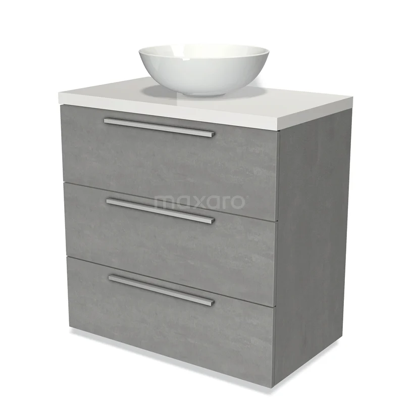 Modulo Plato Badmöbel mit Aufsatzwaschbecken | 80 cm Hellgrauer Beton Flach front Hochglanz Weiß blatt 3 Schubladen