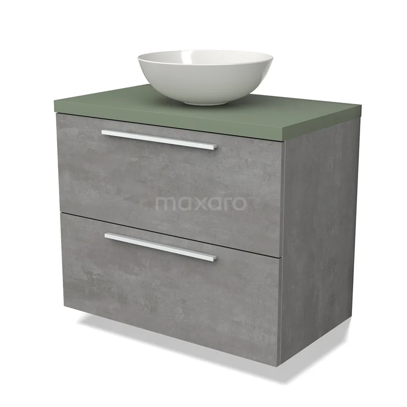 Modulo Plato Badmöbel mit Aufsatzwaschbecken | 80 cm Hellgrauer Beton Flach front Salbeigrün blatt 2 übereinanderliegende Schubladen