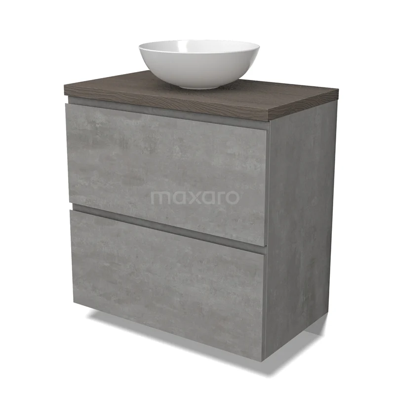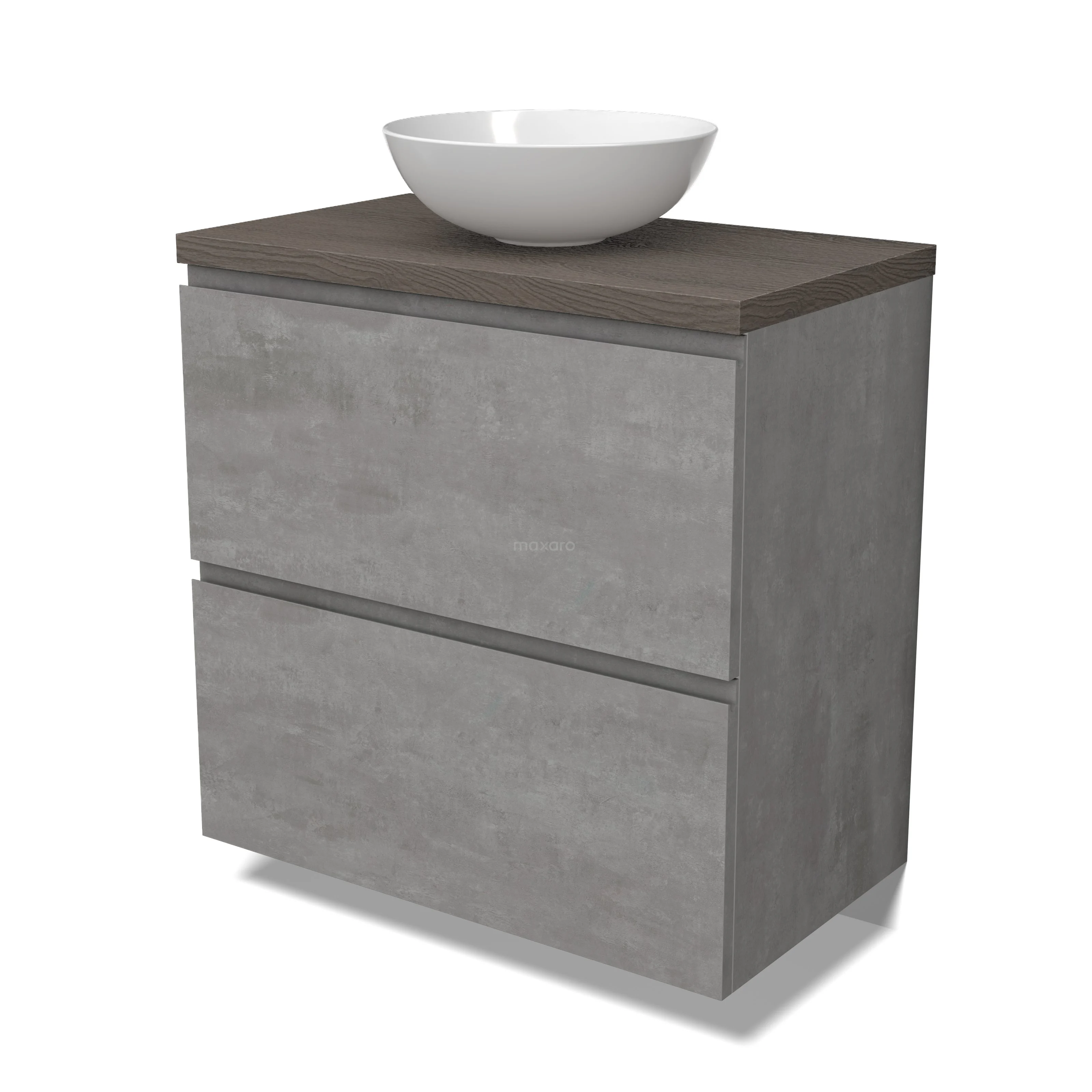 Modulo Plato Badmöbel mit Aufsatzwaschbecken | 80 cm Hellgrauer Beton Grifflos front Dunkelbraune Eiche blatt 2 hohe Schubladen übereinanderliegend