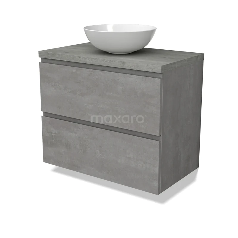 Modulo Plato Badmöbel mit Aufsatzwaschbecken | 80 cm Hellgrauer Beton Grifflos front Graue Eiche blatt 2 übereinanderliegende Schubladen