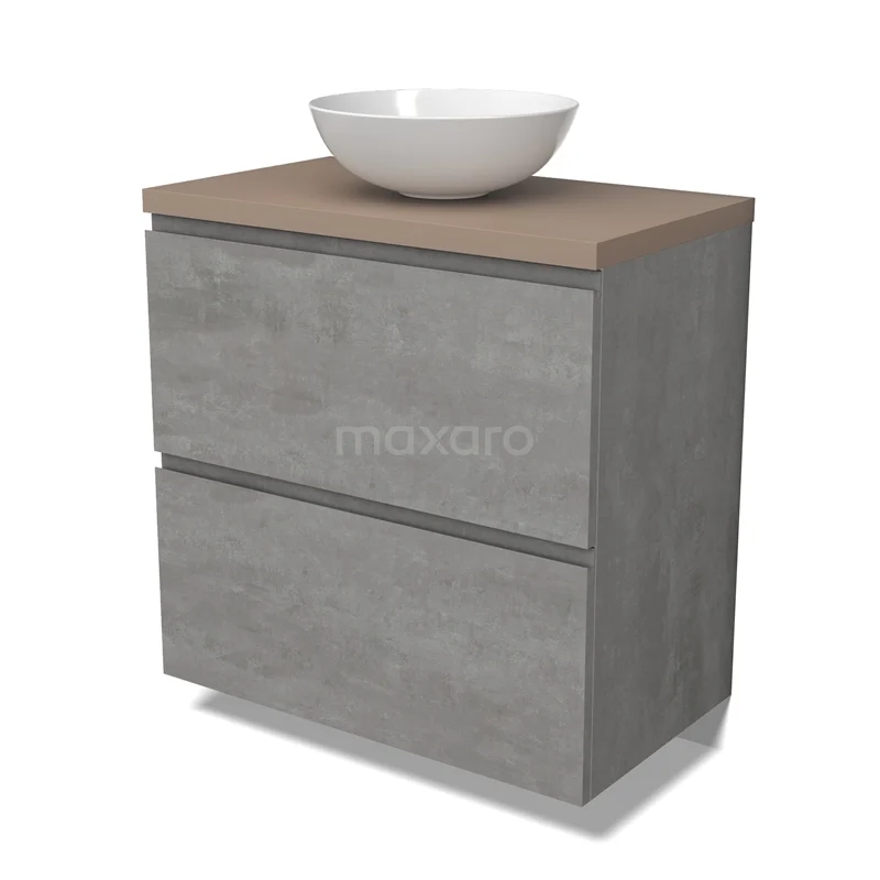 Modulo Plato Badmöbel mit Aufsatzwaschbecken | 80 cm Hellgrauer Beton Grifflos front Taupe blatt 2 hohe Schubladen übereinanderliegend