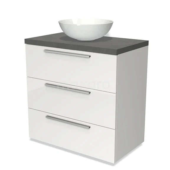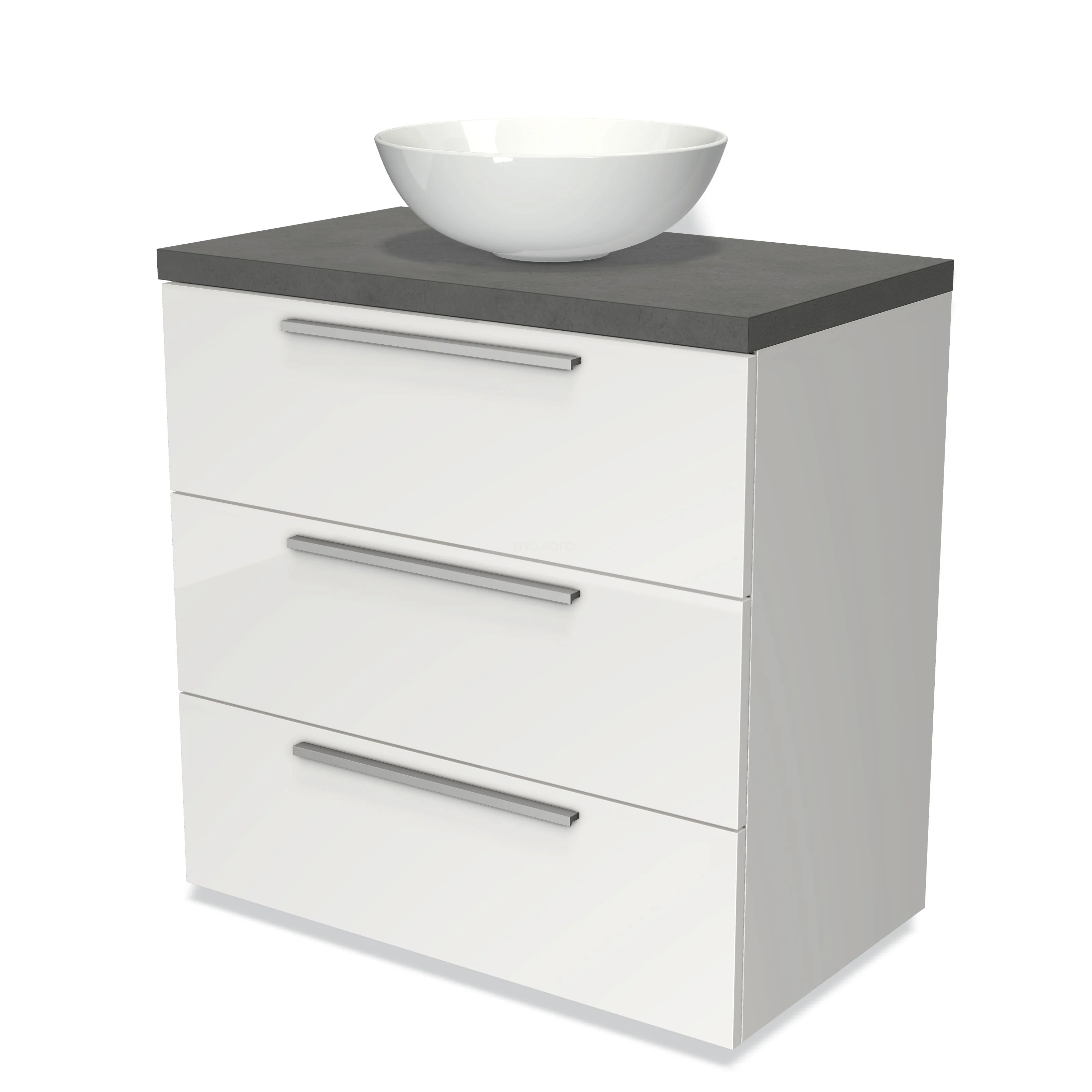 Modulo Plato Badmöbel mit Aufsatzwaschbecken | 80 cm Hochglanz Weiß Flach front Dunkelgrauer Beton blatt 3 Schubladen