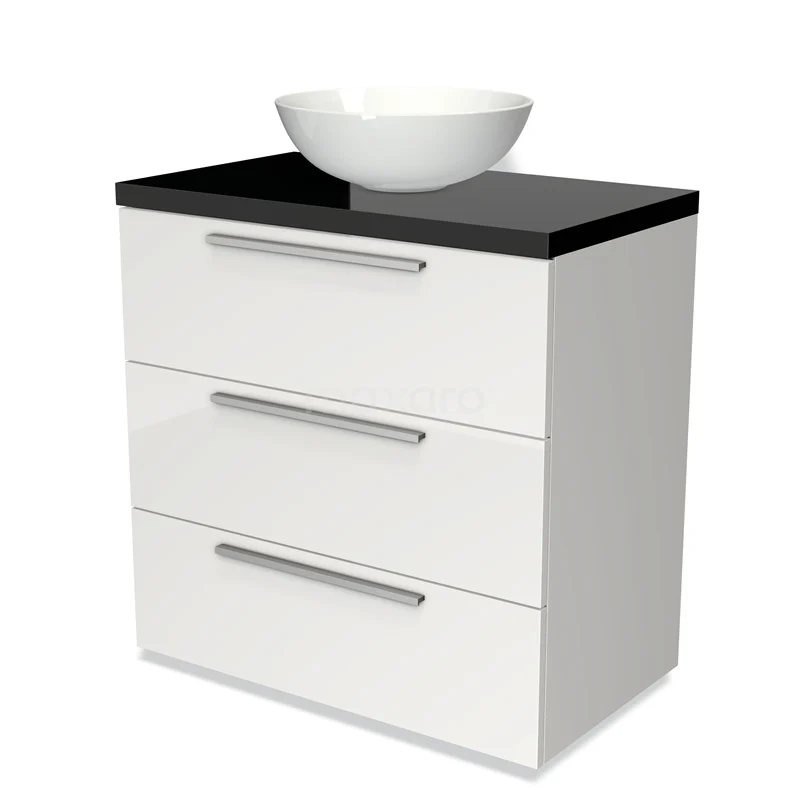 Modulo Plato Badmöbel mit Aufsatzwaschbecken | 80 cm Hochglanz Weiß Flach front Hochglanz Schwarz blatt 3 Schubladen