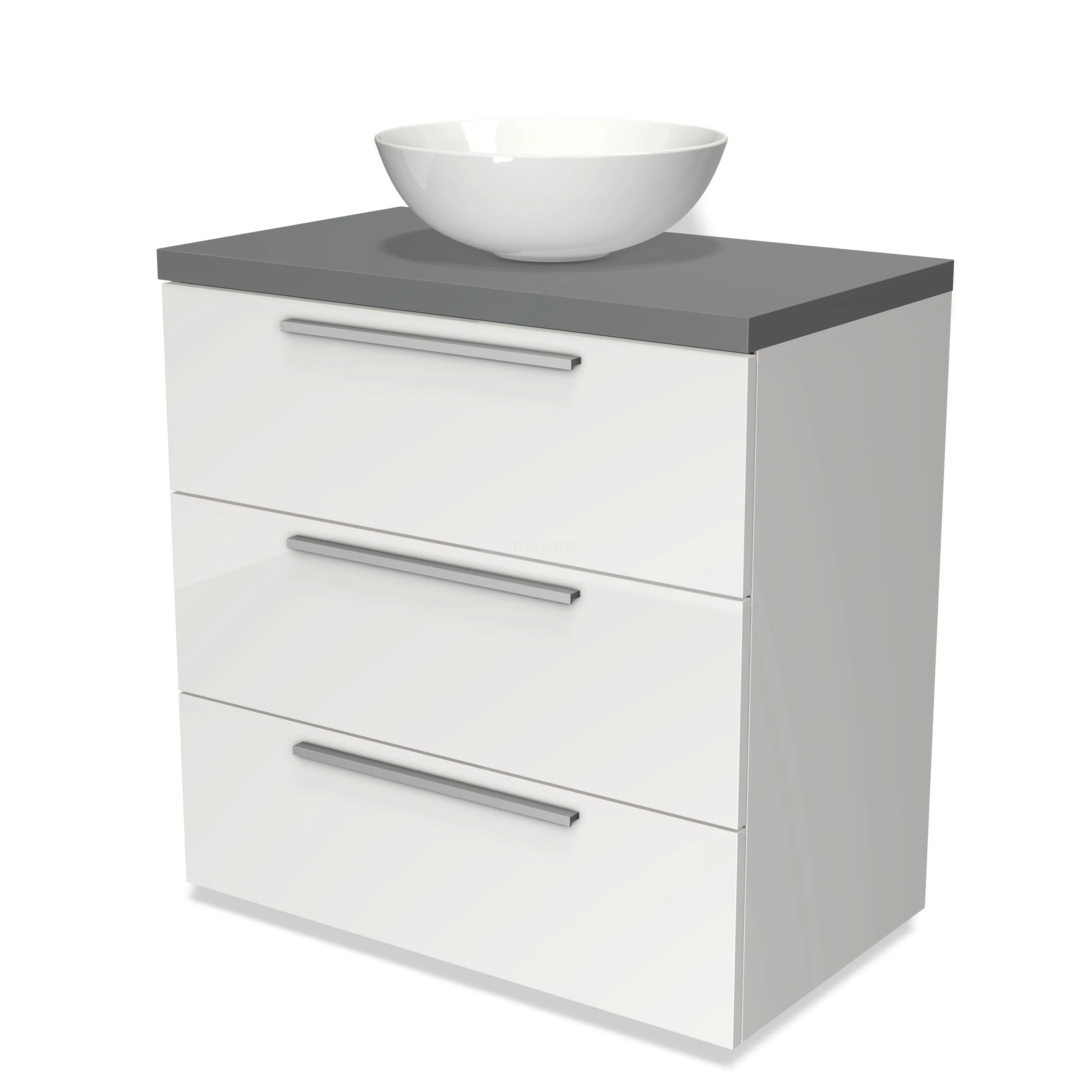 Modulo Plato Badmöbel mit Aufsatzwaschbecken | 80 cm Hochglanz Weiß Flach front Mittelgrau blatt 3 Schubladen