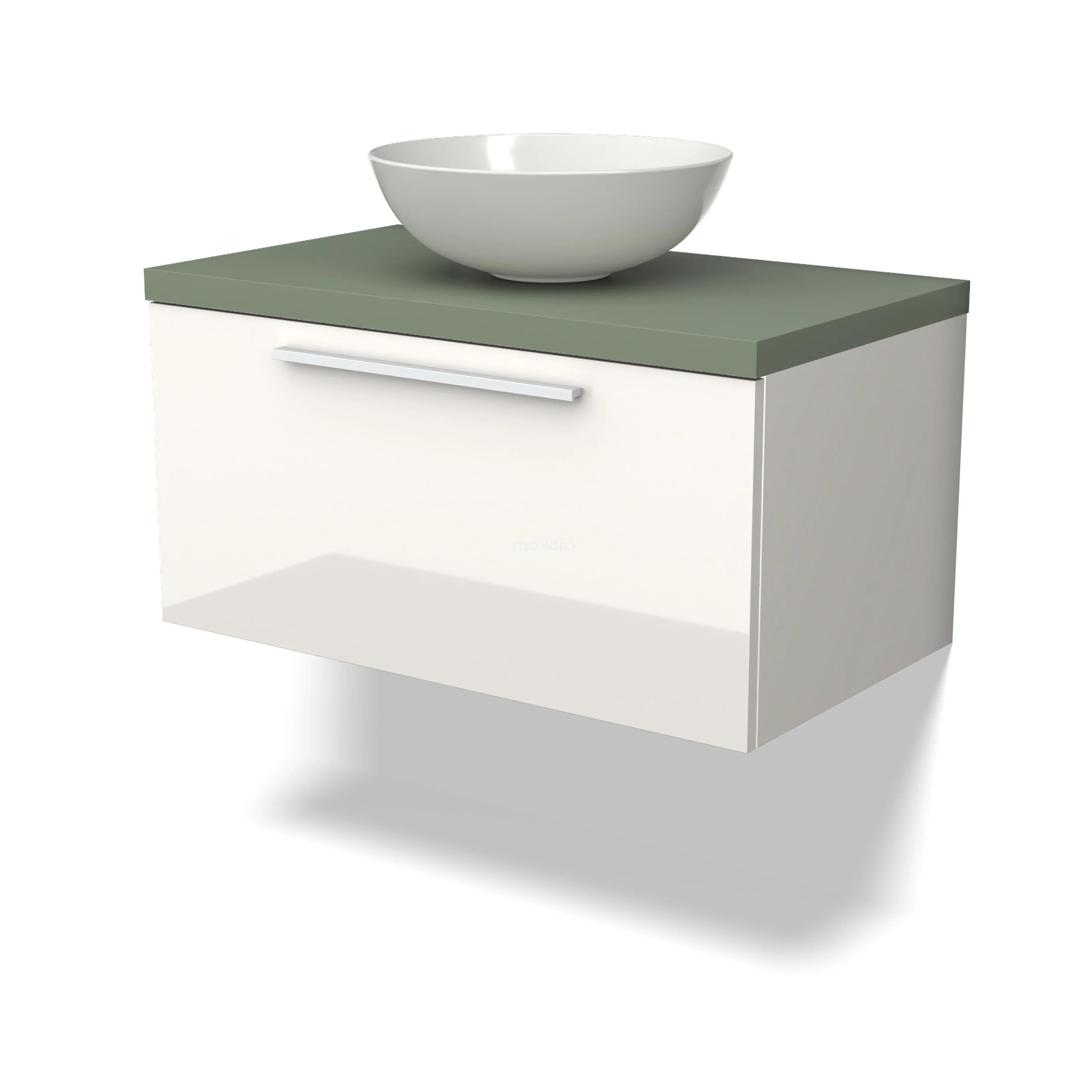 Modulo Plato Badmöbel mit Aufsatzwaschbecken | 80 cm Hochglanz Weiß Flach front Salbeigrün blatt 1 Schublade