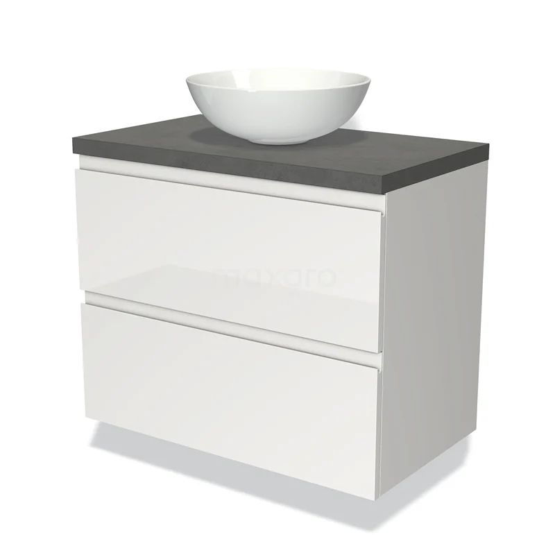 Modulo Plato Badmöbel mit Aufsatzwaschbecken | 80 cm Hochglanz Weiß Grifflos front Dunkelgrauer Beton blatt 2 übereinanderliegende Schubladen