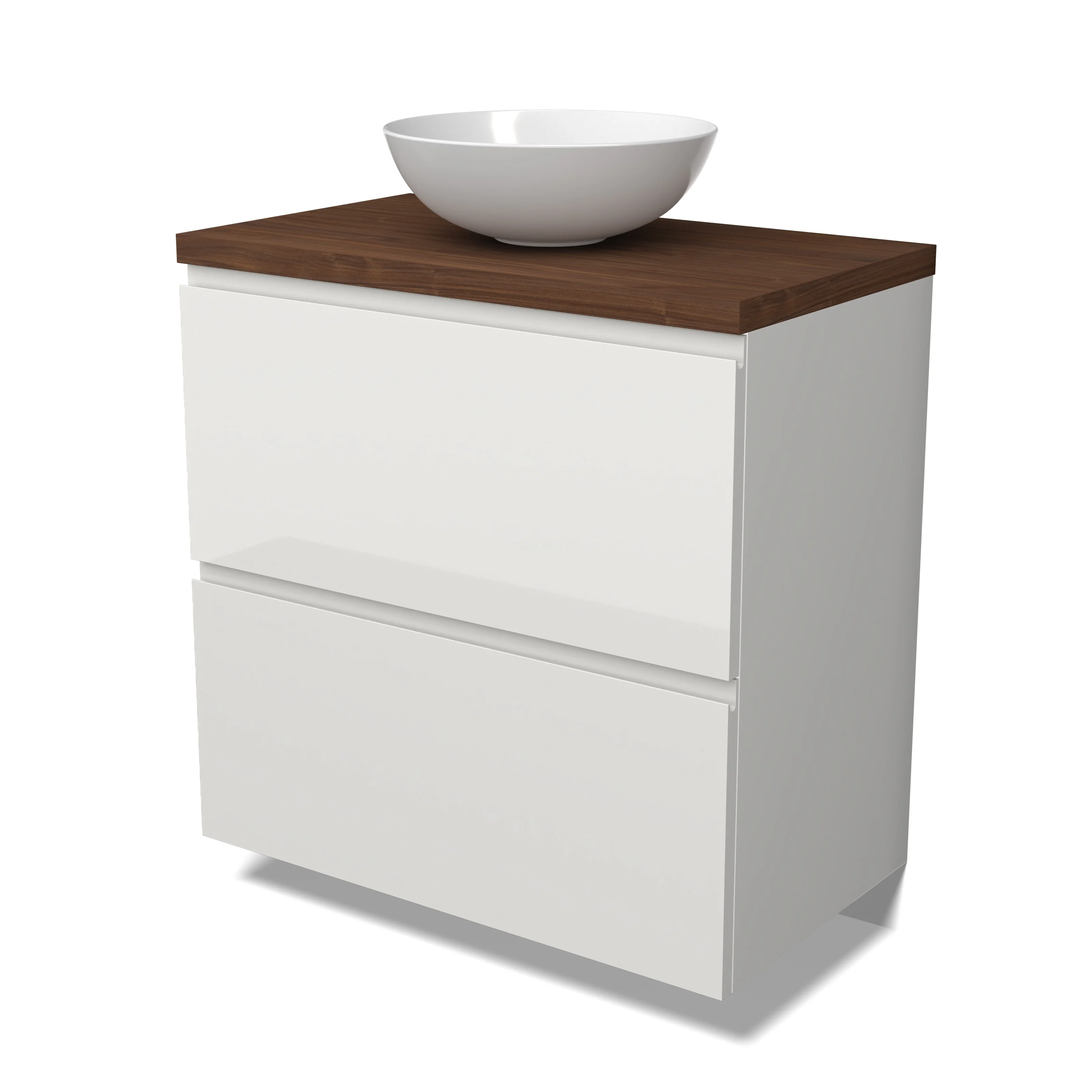 Modulo Plato Badmöbel mit Aufsatzwaschbecken | 80 cm Hochglanz Weiß Grifflos front Walnuss blatt 2 hohe Schubladen übereinanderliegend