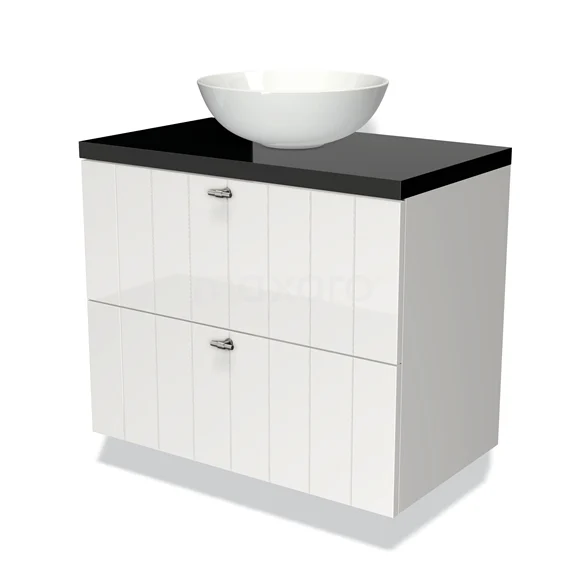 Modulo Plato Badmöbel mit Aufsatzwaschbecken | 80 cm Hochglanz Weiß Lamelle front Hochglanz Schwarz blatt 2 übereinanderliegende Schubladen