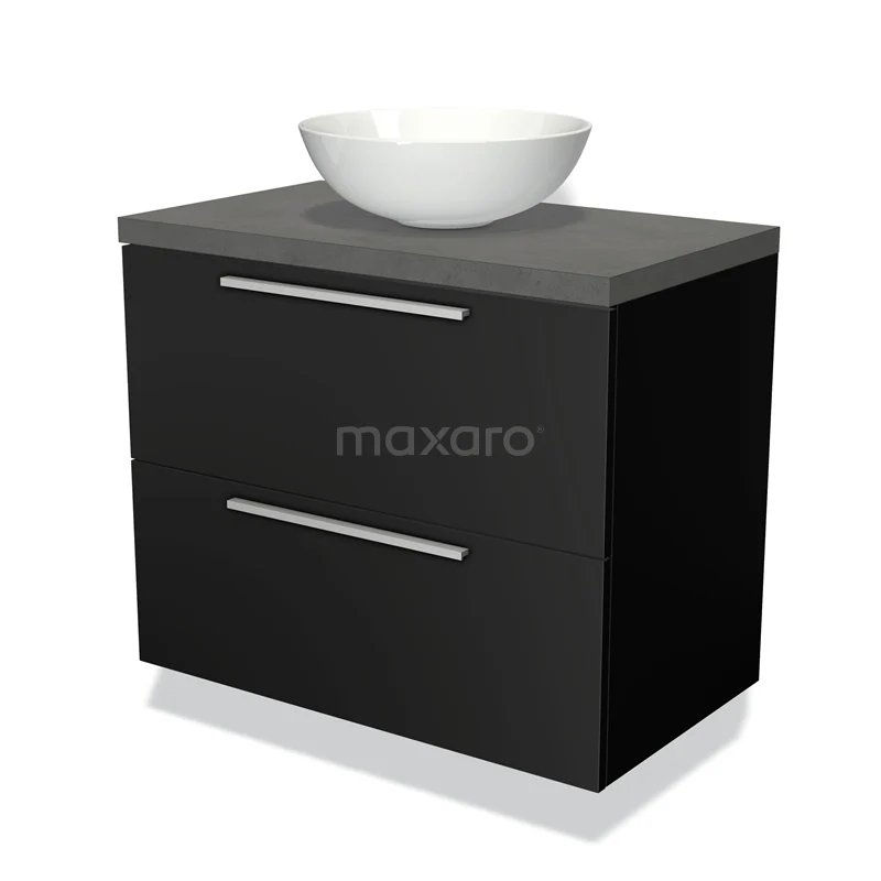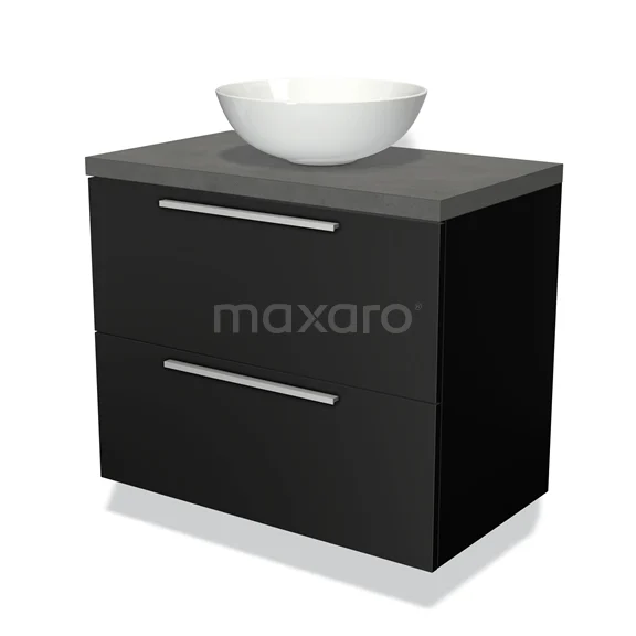 Modulo Plato Badmöbel mit Aufsatzwaschbecken | 80 cm Matt Schwarz Flach front Dunkelgrauer Beton blatt 2 übereinanderliegende Schubladen